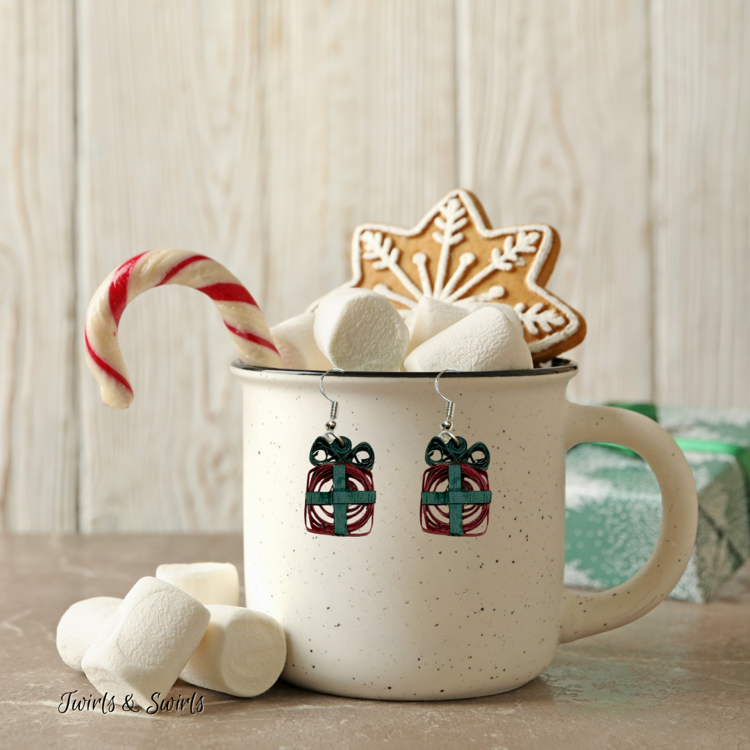 Unwrap a little joy with these *Gift Box Earrings*! Hand-rolled from paper in a rich, deep red and topped with a dark green ribbon and matching bow, each pair looks like it came straight from under the Christmas tree.