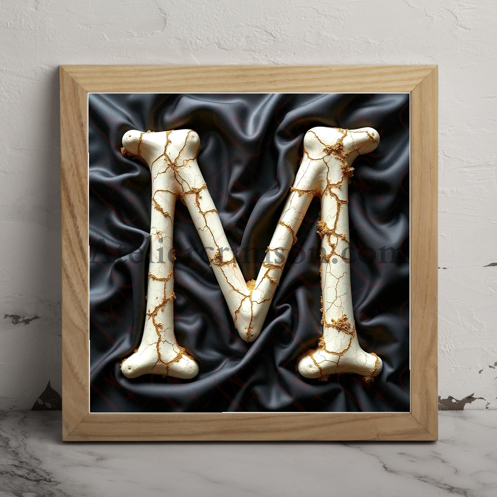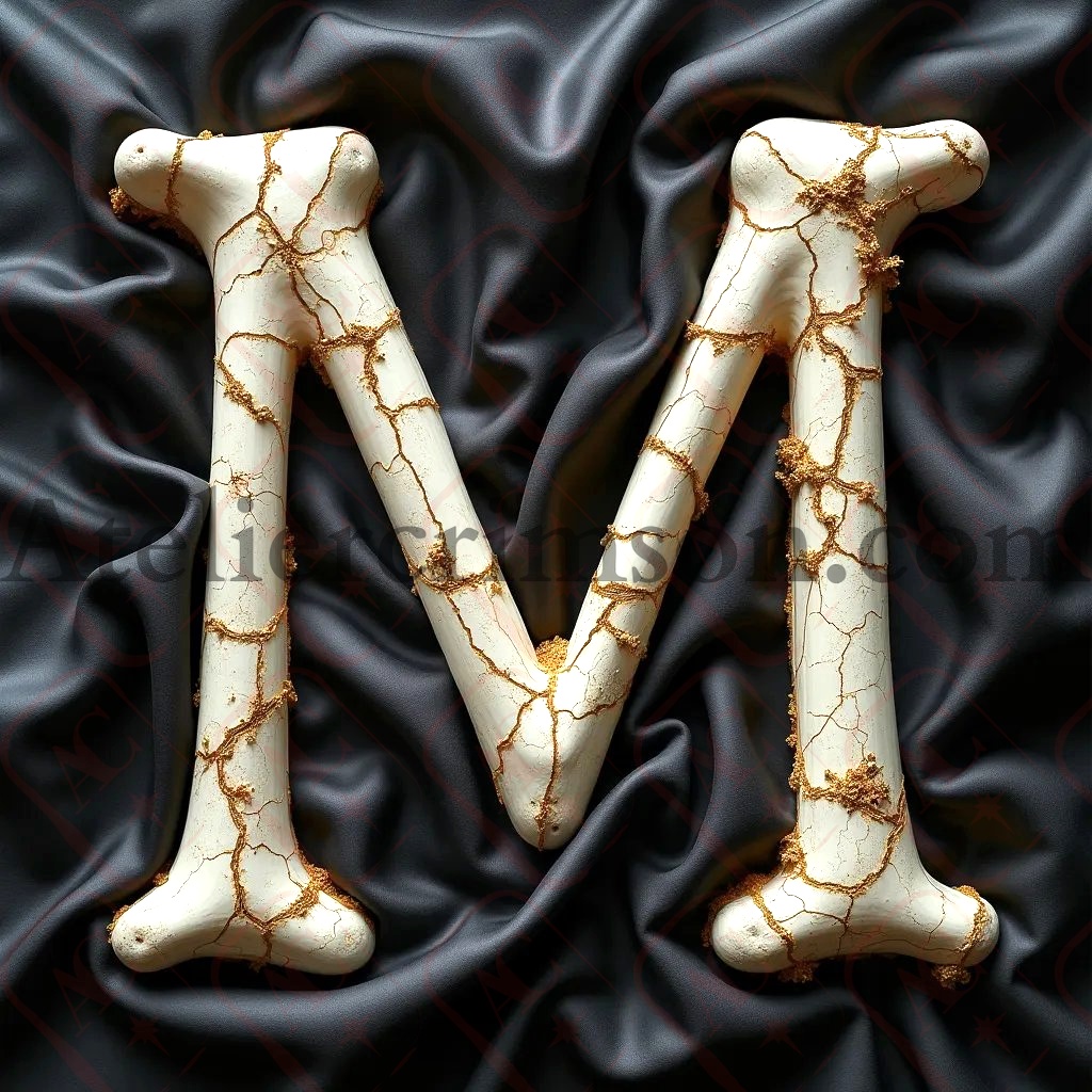The letter M Bones with gold fissures A hauntingly beautiful character crafted from pristine human femur bones, intricately arranged to form a bold, serif typeface. Delicate golden fissures, reminiscent of kintsugi art, weave through the ivory-white osseous structure, adding an element of elegant repair. The character stands proudly on a luxurious marbled floor, its form casting subtle shadows. Behind it, a textured black linen backdrop provides a striking contrast, emphasizing the letter's ethereal beauty.