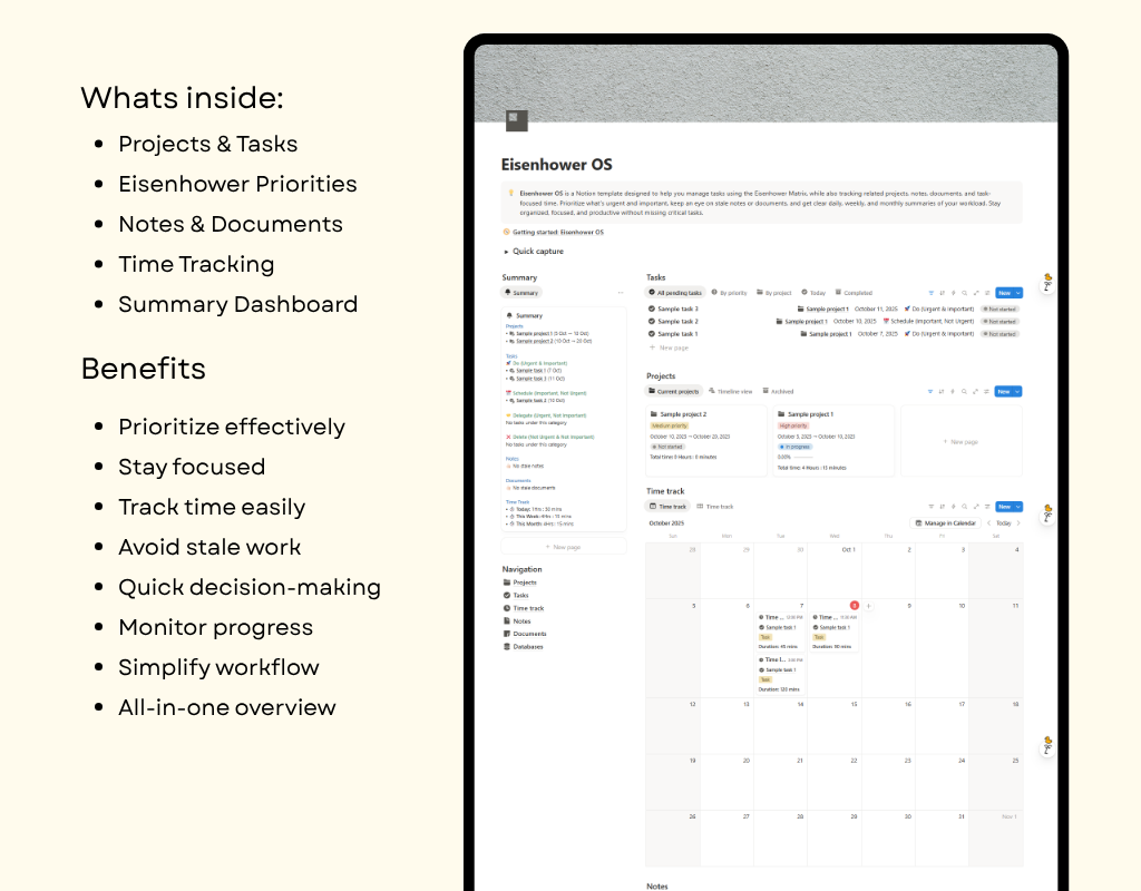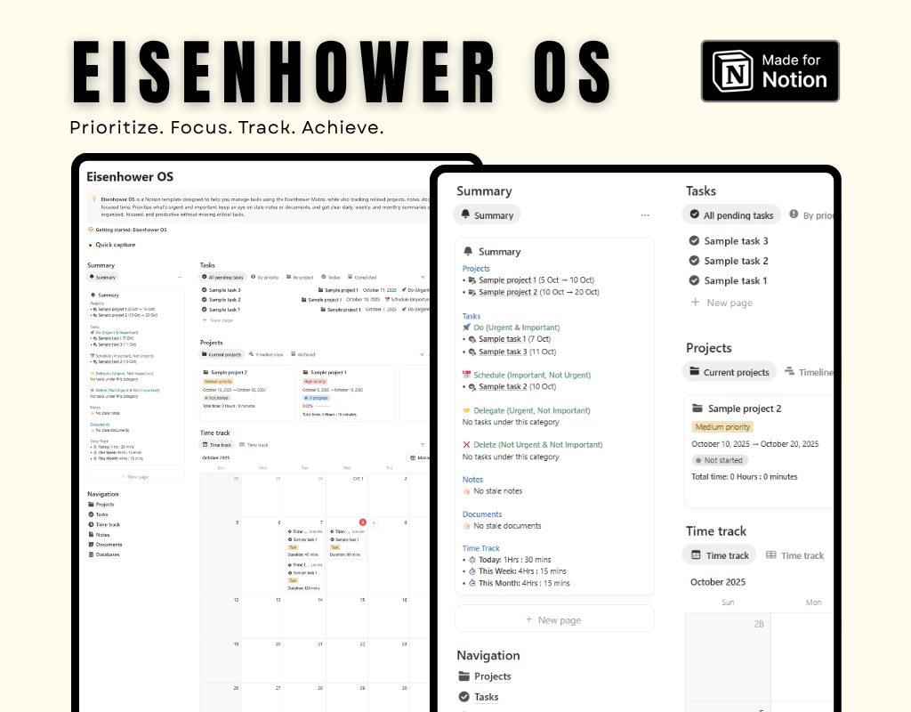 Eisenhower OS is an all-in-one Notion template built for anyone who wants to manage tasks, projects, notes, and documents efficiently, while prioritizing what truly matters using the Eisenhower Matrix.