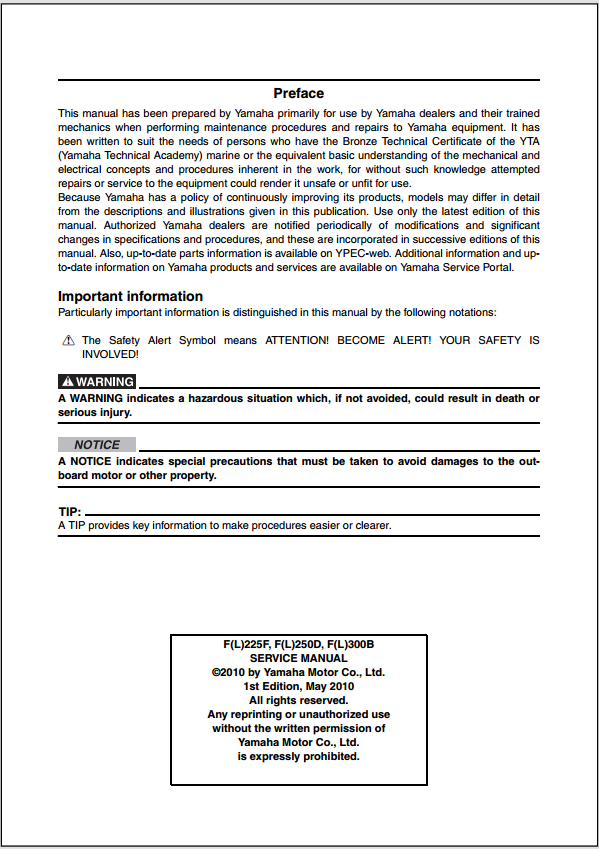 2010 Yamaha F(L) 225F F(L) 250D F(L) 300B Outboard Motor Service Manual