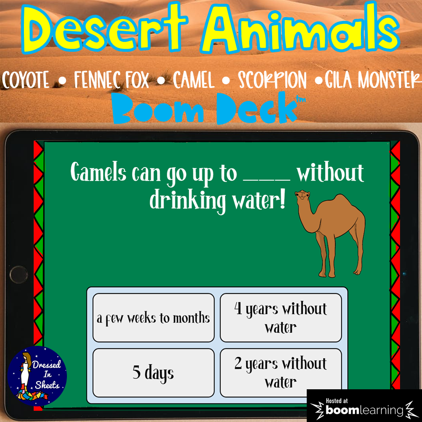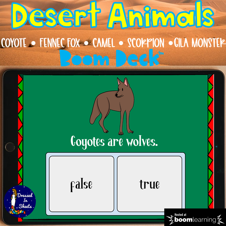 This BOOM deck is about desert animals that everyone knows- but doesn't know some awesome facts about! Includes fun facts about camels, the fennec fox, the coyote, the scorpion, and the gila monster! After their reading the kiddos will get to answer questions regarding these awesome desert animals.