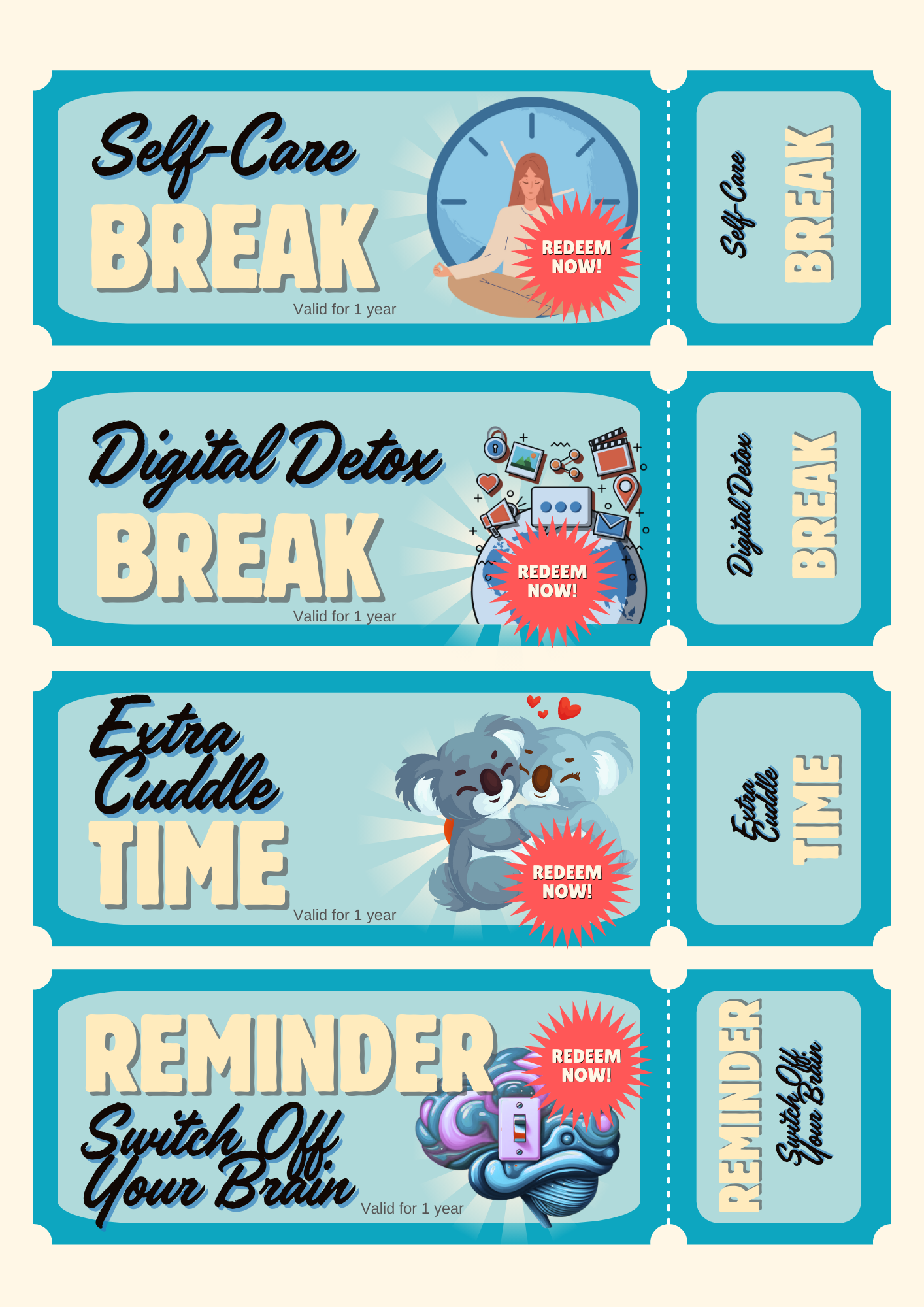 Surprise your partner, family, or friends with these printable love coupons, specially designed to promote self-care and emotional connection from a neurodivergent perspective. They are perfect for Valentine's Day, anniversaries, or just to remind ourselves of the importance of self-love and understanding. READY TO PRINT, NOT EDITABLE.