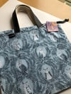 Mede entre 32-35 cms por 32-38 cms, tem um bolso interior, alças em pele feitas a partir de desperdício da indústria do calçado.