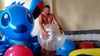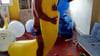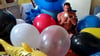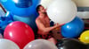 After that he use his hands and teeth to burst the giant balloons in the room.