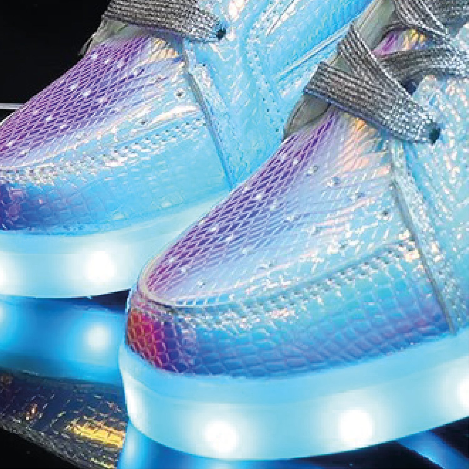 - Design "Snake Silver" Miroir : L'empeigne en cuir effet miroir holographique arbore un motif serpentin spectaculaire. Elle capte la lumière du jour et reflète l'ambiance, faisant de vous le point de mire avant même d'allumer les LED.