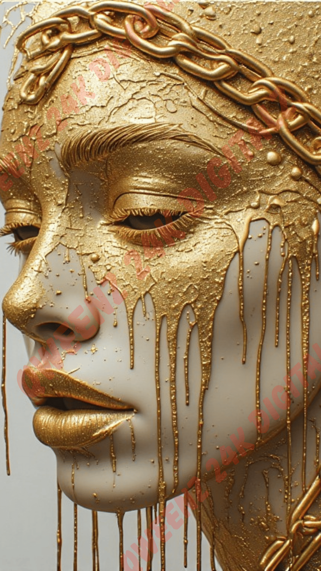 The dripping metallic textures create a powerful contrast between luxury and pain, while the closed eyes symbolize peace, reflection, and the unspoken stories we carry.