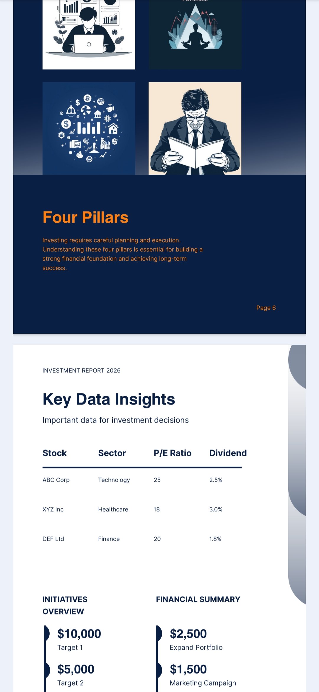 This 8‑page visual guide introduces beginners to the four essential pillars of successful investing and explains how to use key financial data when making investment decisions.