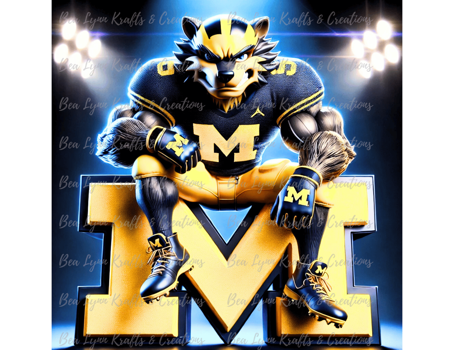 Brace yourself for Big Ten dominance with this electrifying University of Michigan Wolverine PNG! Featuring a ferocious, muscle-bound Wolverine mascot in full game-day gear, this beast is crouched atop a massive golden "M," exuding pure gridiron intensity. Dressed in navy and maize and football cleats locked in, this image screams victory, pride, and raw power. It’s built for die-hard Michigan fans and creators who want to capture that unshakable Wolverine spirit.