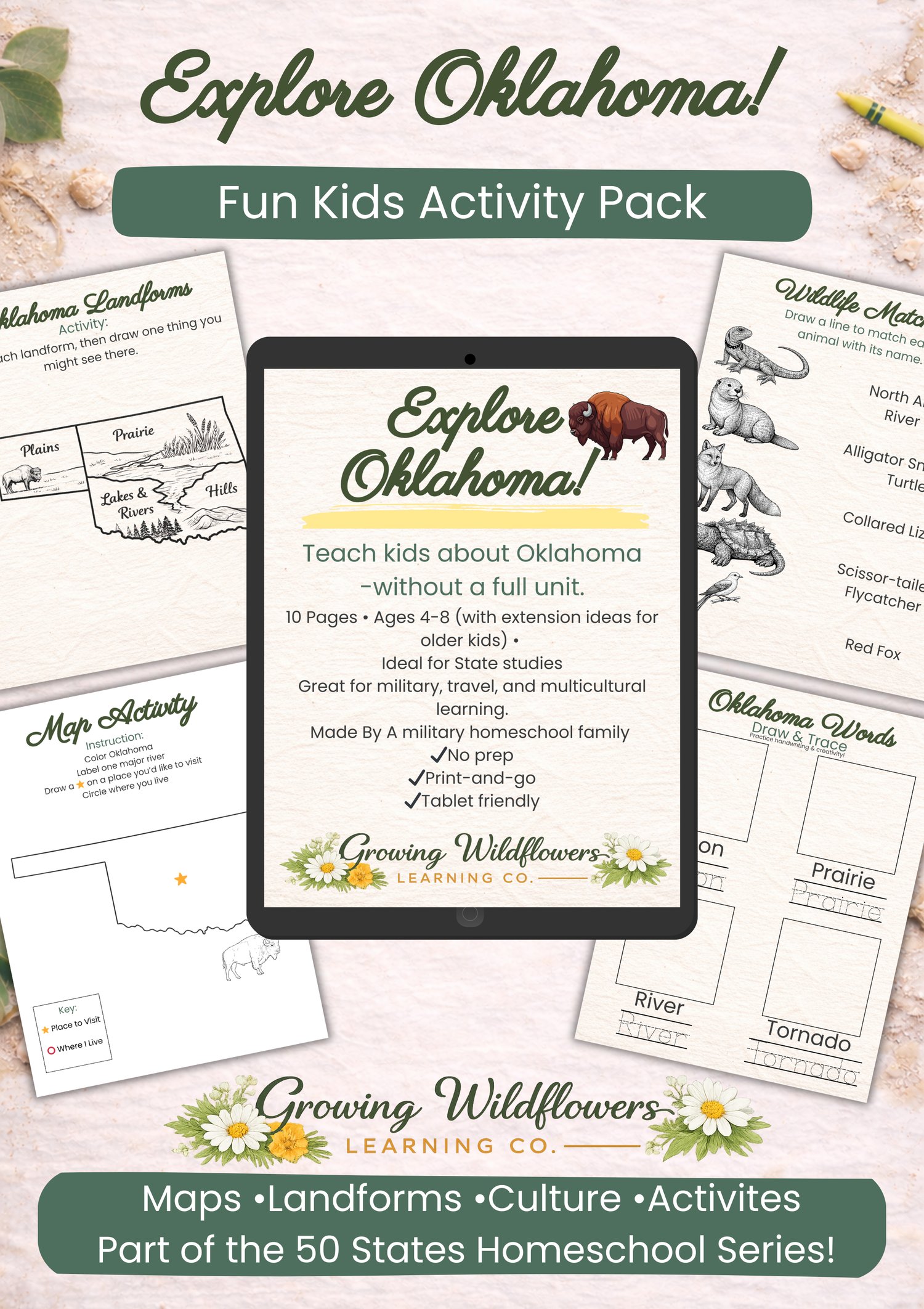 This packet introduces children to Oklahoma through maps, landforms, wildlife, culture, and hands-on activities — without the overwhelm of a full unit study.