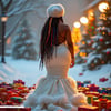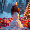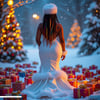 A stunning model showcases a graceful white backless holiday dress, exuding festive elegance. Surrounded by beautifully wrapped Christmas gifts, she embodies the spirit of the season with sophistication and timeless style.