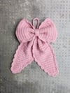 Den lyserøde Noelia Sløjfe er strikket i Double Sunday fra Sandnes Garn i farve 4033.