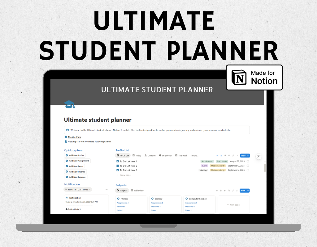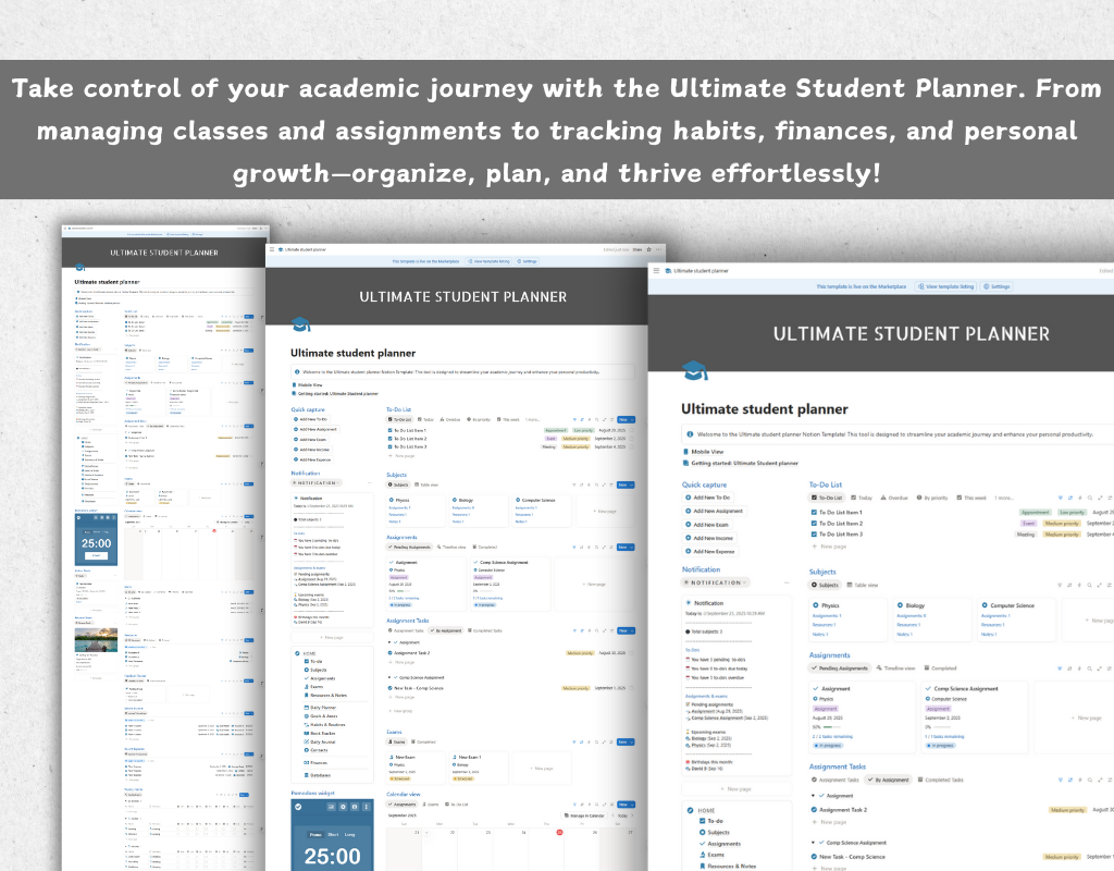 Take control of your academic journey and personal growth with the Ultimate Student Planner, your all-in-one Notion dashboard. This comprehensive template is designed to help you balance school, life, and personal well-being, so you can stop feeling overwhelmed and start thriving.