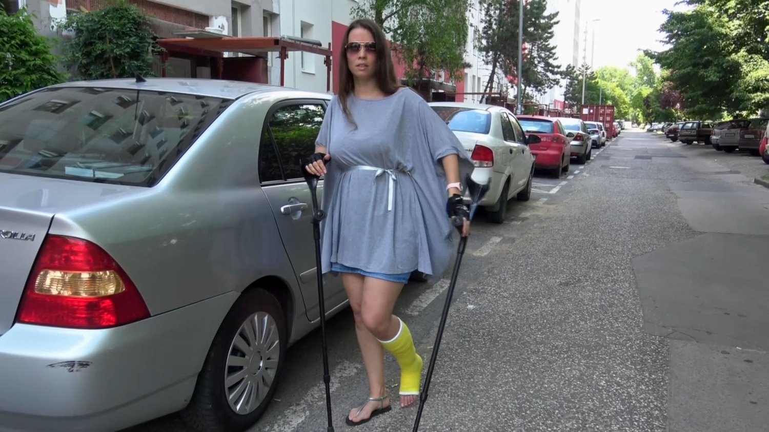 Lucy is on her way to a friend but unfortunately it was difficult to find parking so she had to park the car a good distance from her friend's house.This is not so fun for Lucy how is in a yellow short leg cast after an accident.We follow Lucy when she crutch to her friend and get some good closeup and lots of crutching in this clip.