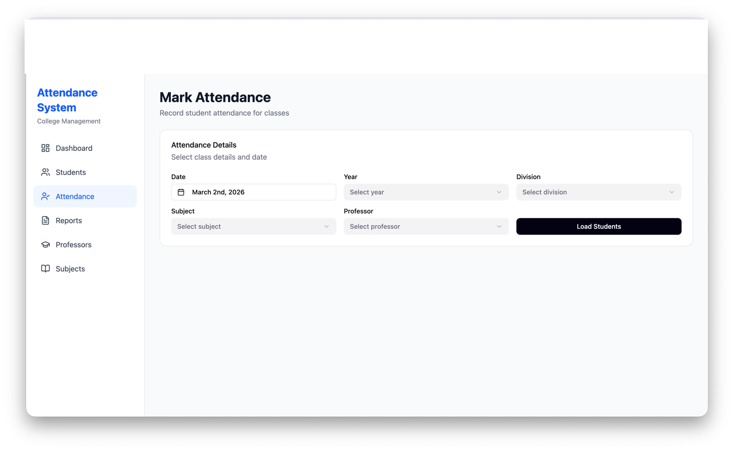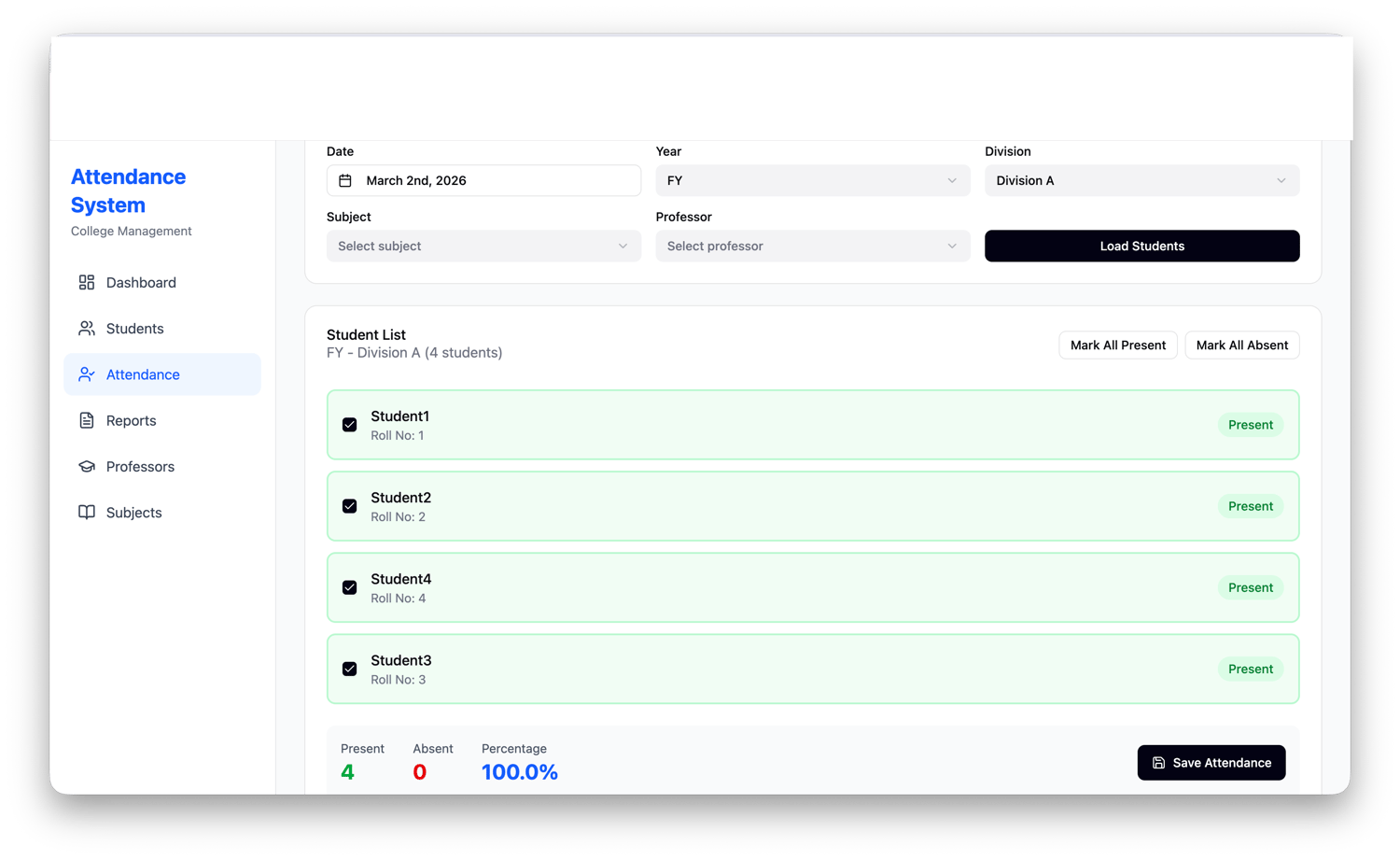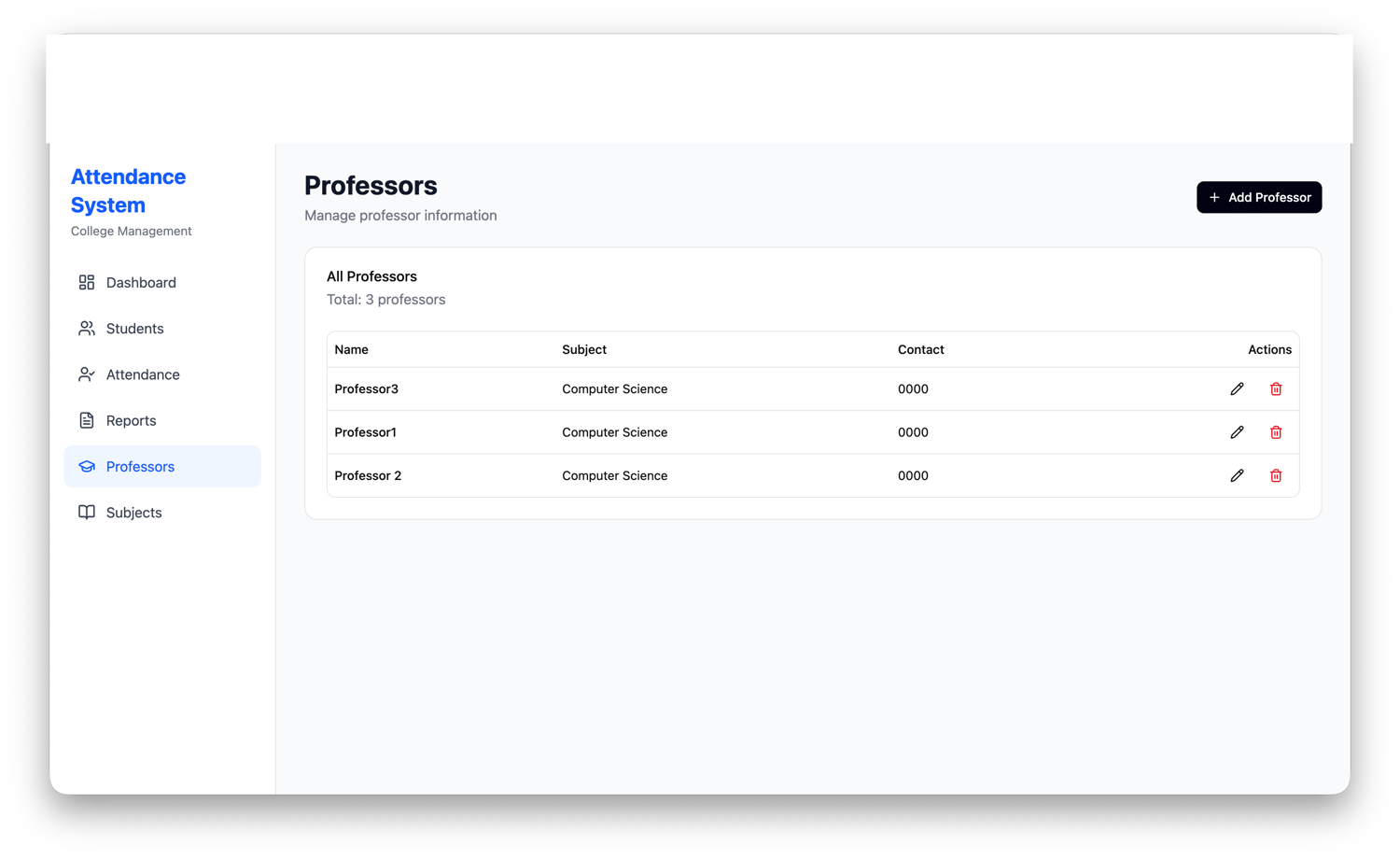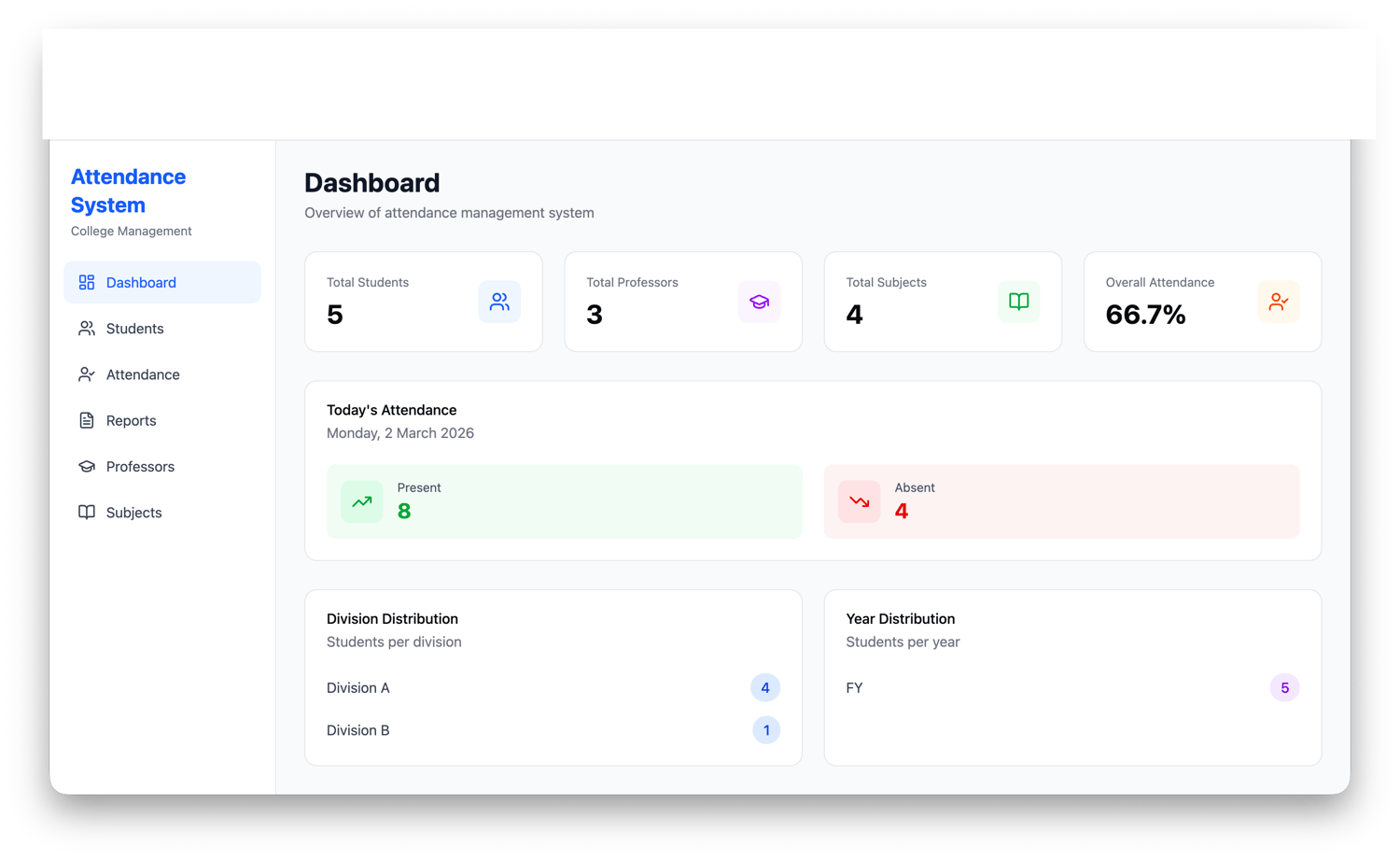 This system is designed for colleges, coaching institutes, schools, and student projects. It provides an easy interface to manage students, professors, subjects, and attendance records with a powerful dashboard analytics system.