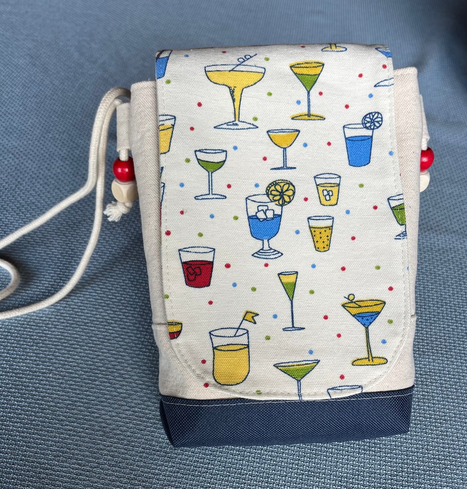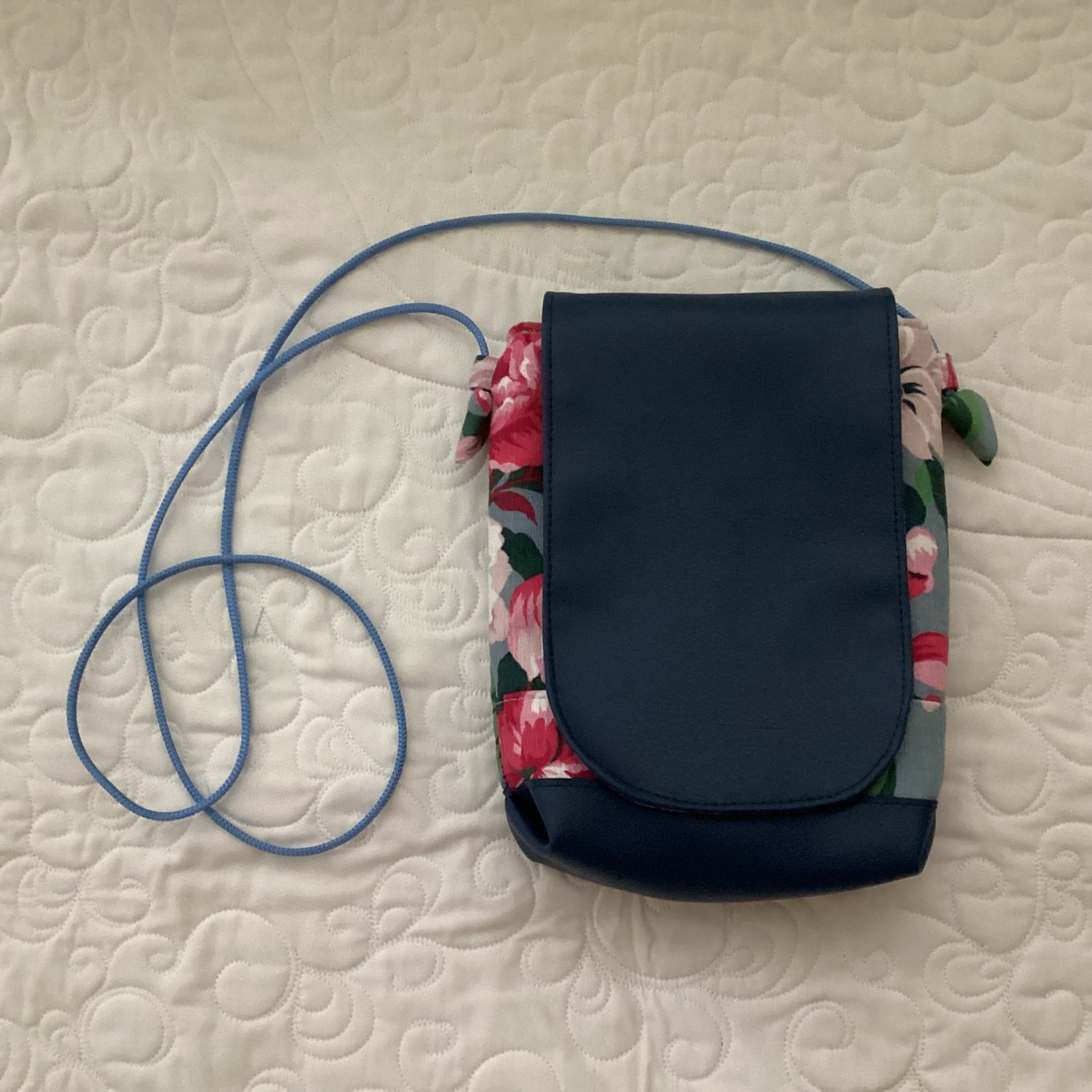 Make SMALL with a narrow cording strap or make a self strap with fabric. Use a non-woven contrast for the base. Or get wild and use it for the strap loops too.