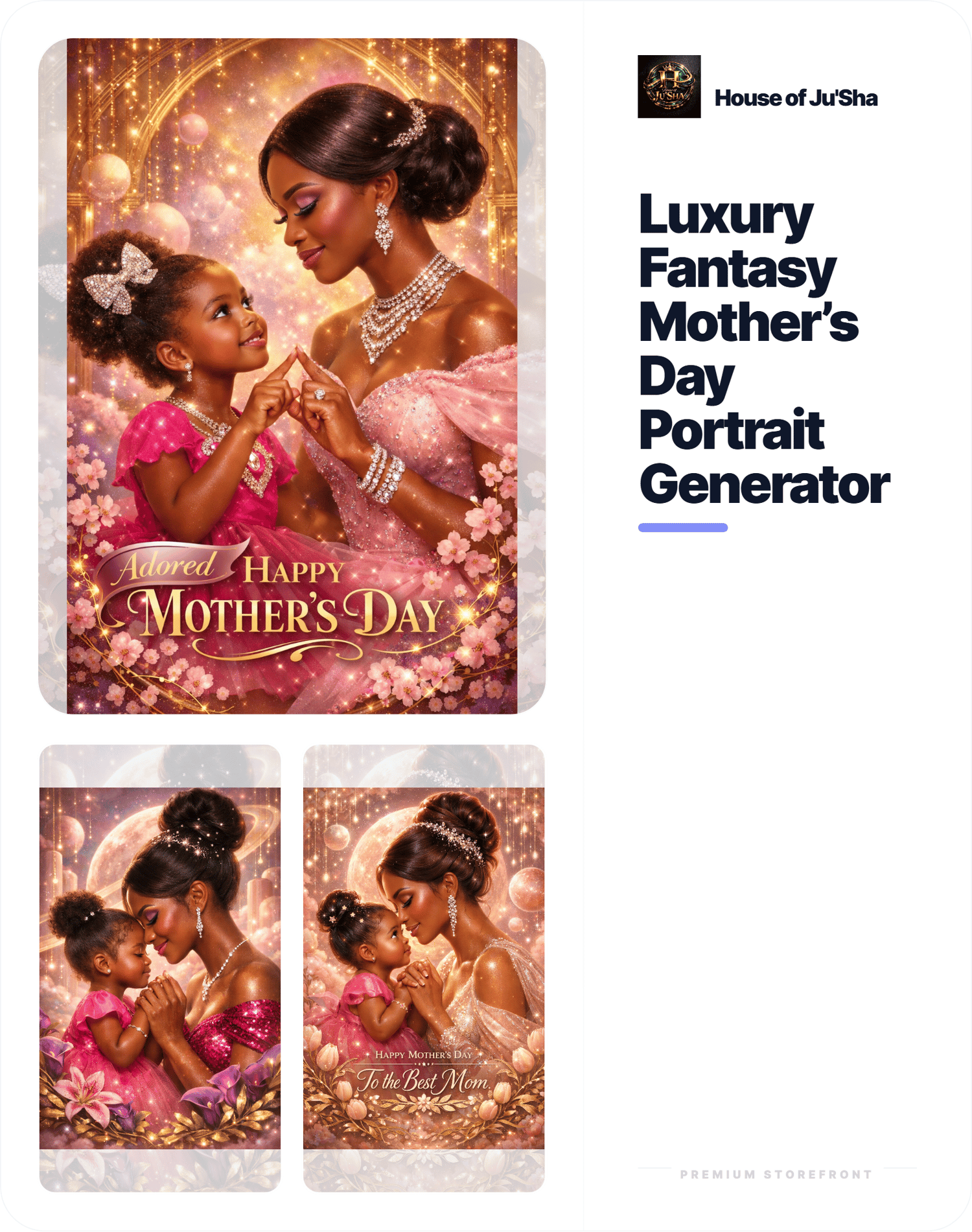 Create breathtaking, high-end Mother’s Day masterpiece prompts with this gorgeous HTML generator designed for luxury fantasy, celestial glamour, and emotional Black mother-and-daughter portrait art.