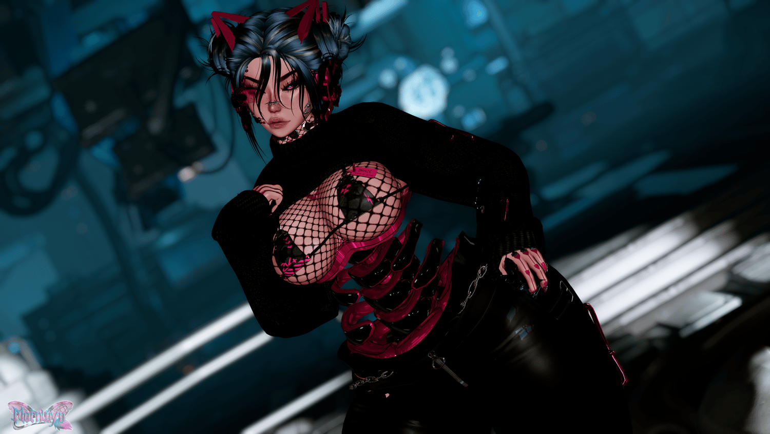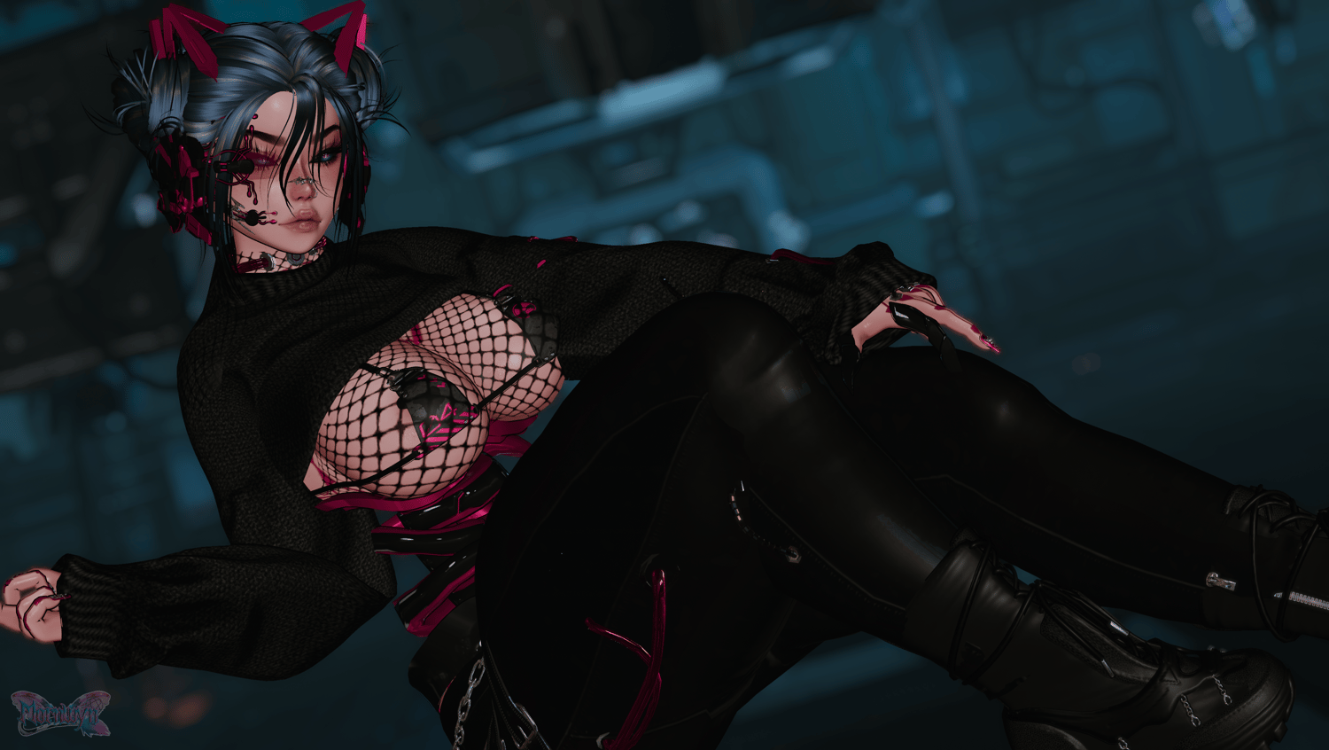 body (EDITED BY ME/NO REUSE) | head (EDITED BY ME/NO REUSE) | eye textures | body textures | chained halter/pleasers/sweater | hair | hairs | pants | cyber wraith outfit | chunky boots | cyber eye/ears | headphones | scarf | mask | cyber tattoos | cyber centipedes | cyber tubes/spine/coat | metal spine | cyber boots | cyber sneakers | cyber decals | base spine | chunky boots | cyber bikini | bandeau | pasties |