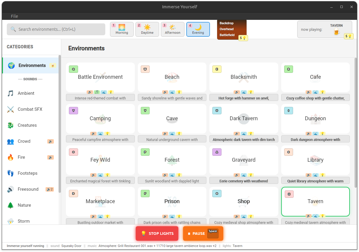 Tags: ttrpg, tabletop rpg, ambient, soundscape, ambience, dnd, dungeons and dragons, smart lights, wiz, spotify, free
