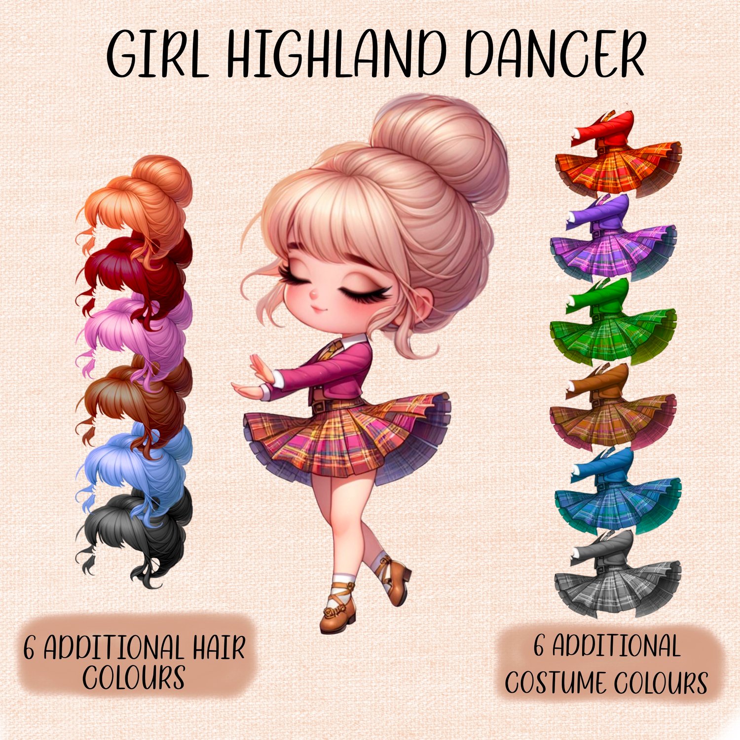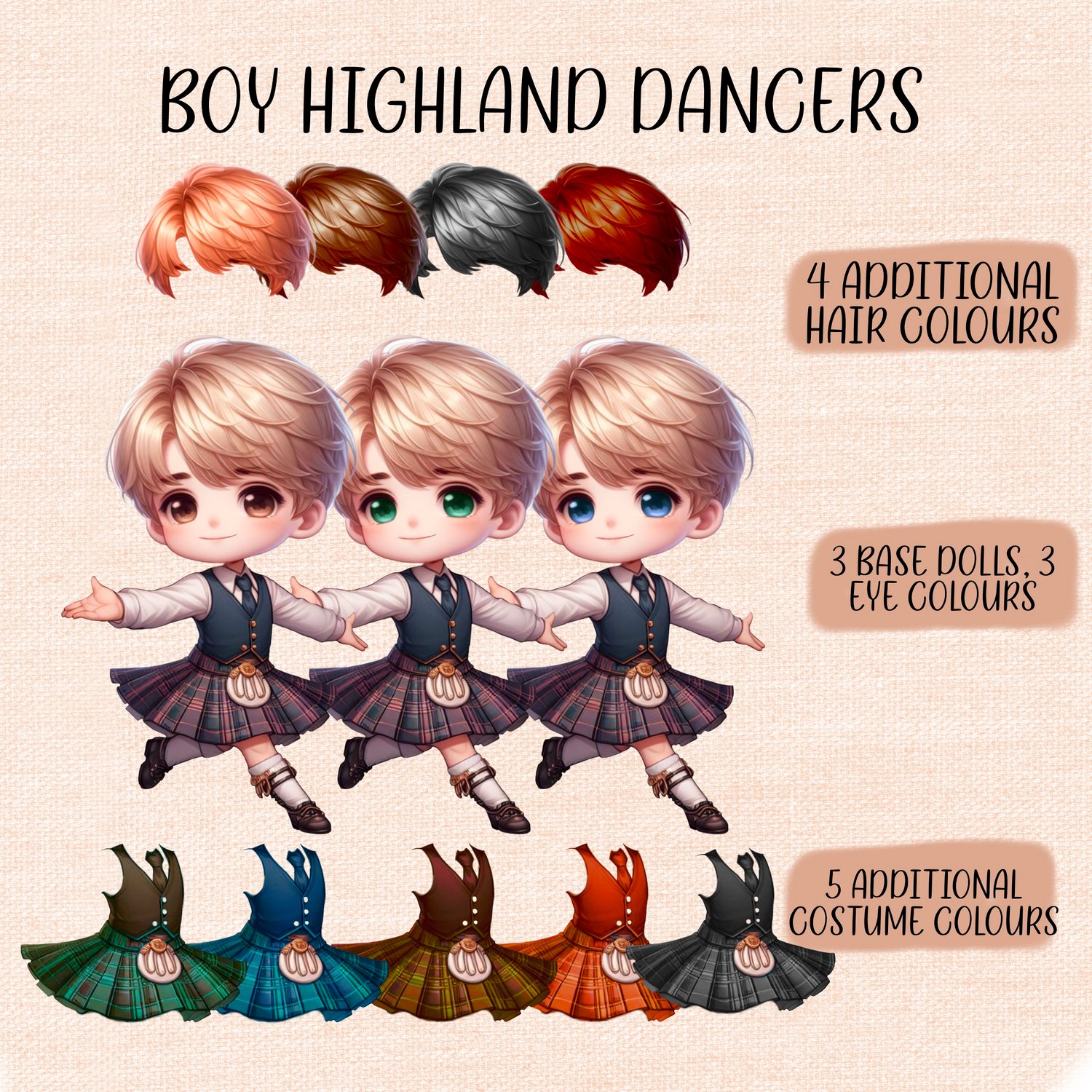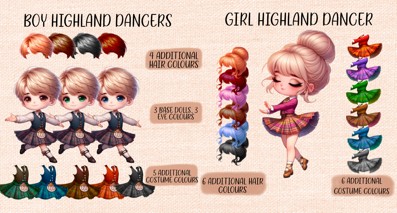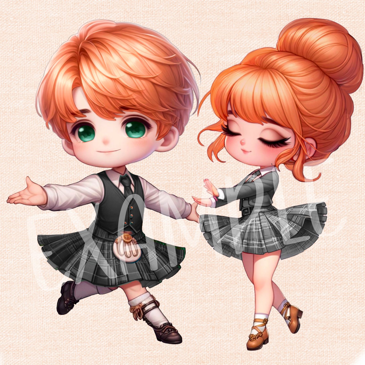 Beautiful boy and girl Highland Chibi dancer dolls. 25 PNGs, hair and costume clipart. Sublimation, print. Instant Download.