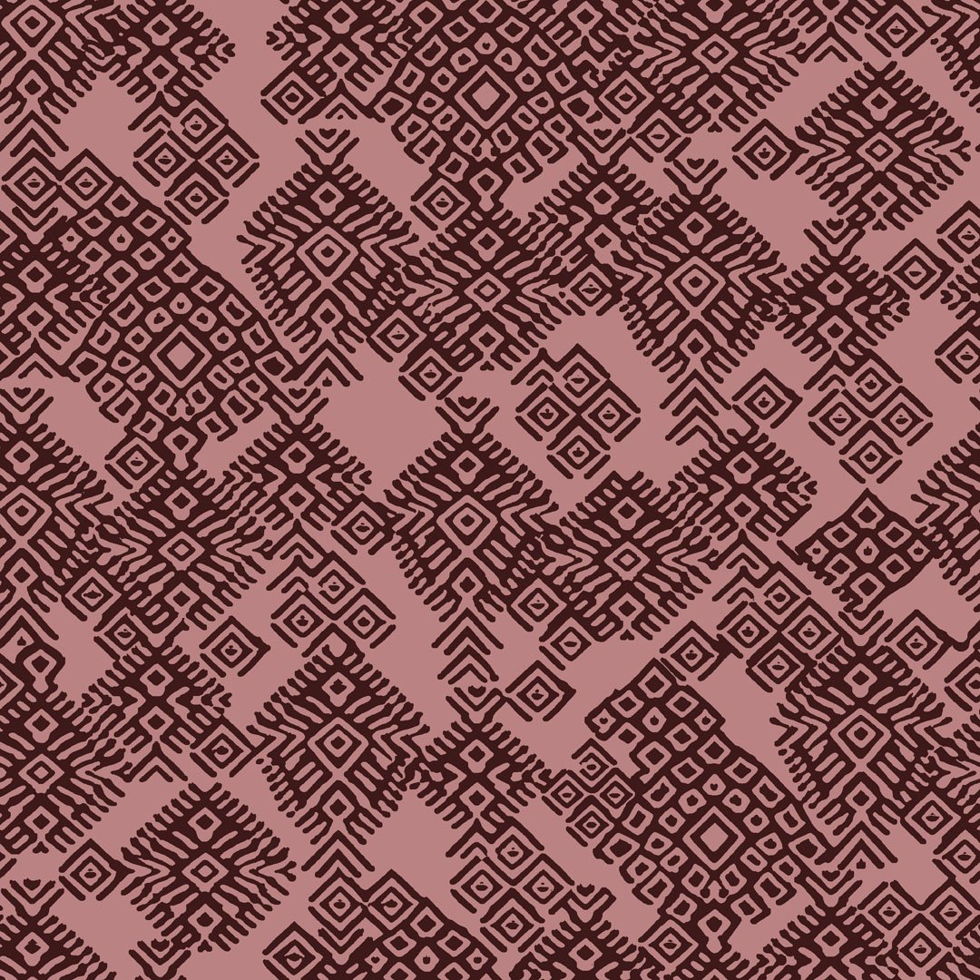 Intricate diamond & line motifs in dark maroon on muted mauve base