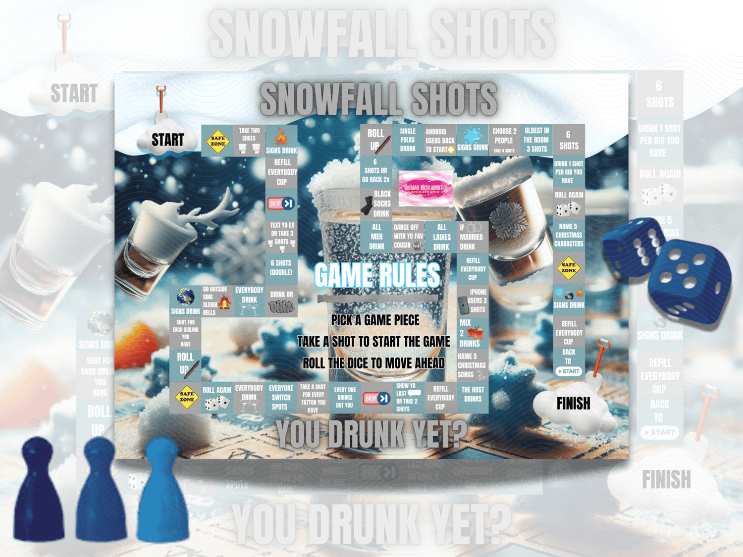 Elevate your holiday gatherings with "Snowfall Shots," the ultimate winter-themed drinking game that guarantees a flurry of fun and laughter! Designed to bring friends and family together, this game board will turn any night into a memorable holiday celebration.