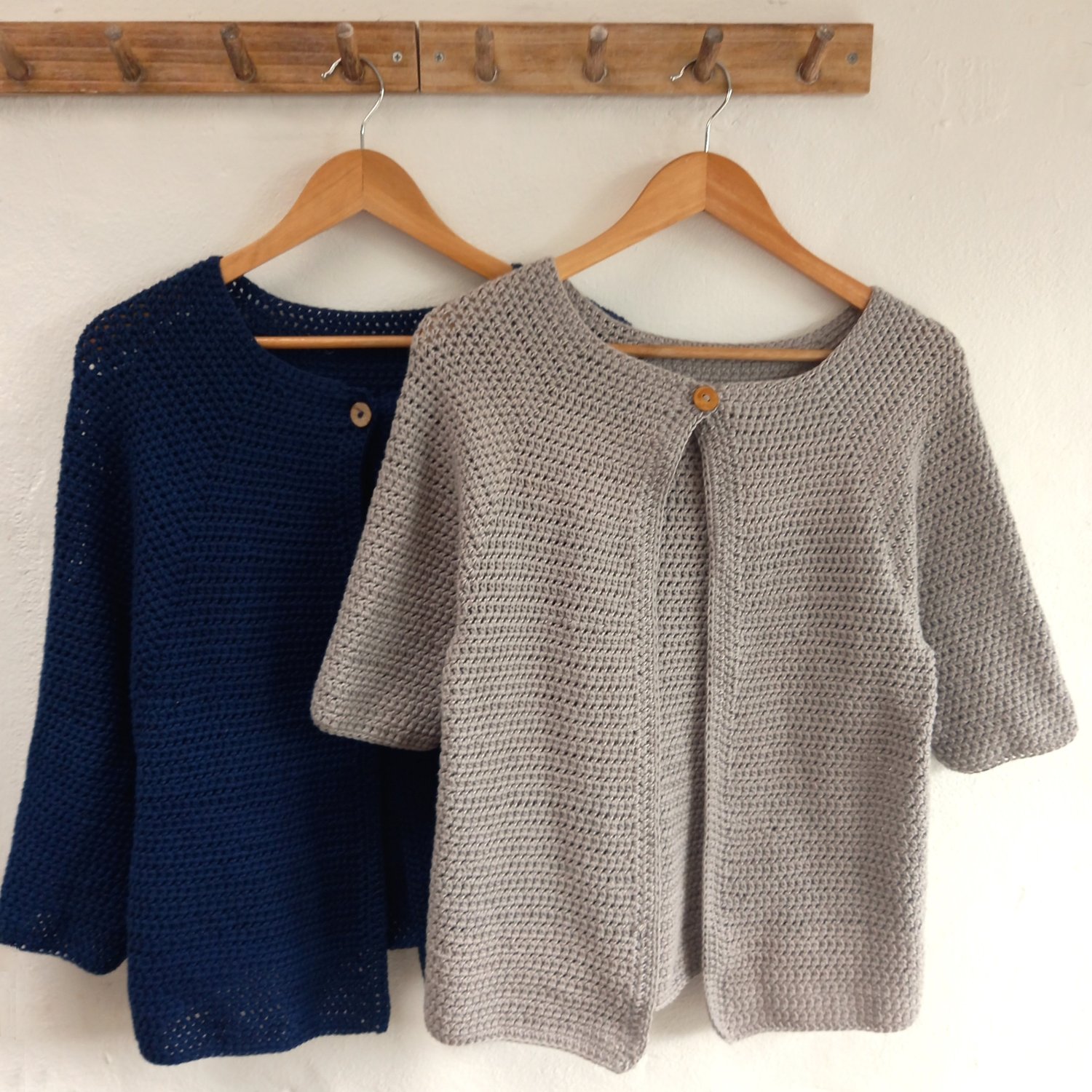 The cardigan is crocheted all in one piece from the yoke down, with sleeves added at the end.