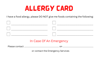 This handy business card size food allergy card can be printed, cut to size, and filled out with the relevant information before laminating and taking it with you on holiday.