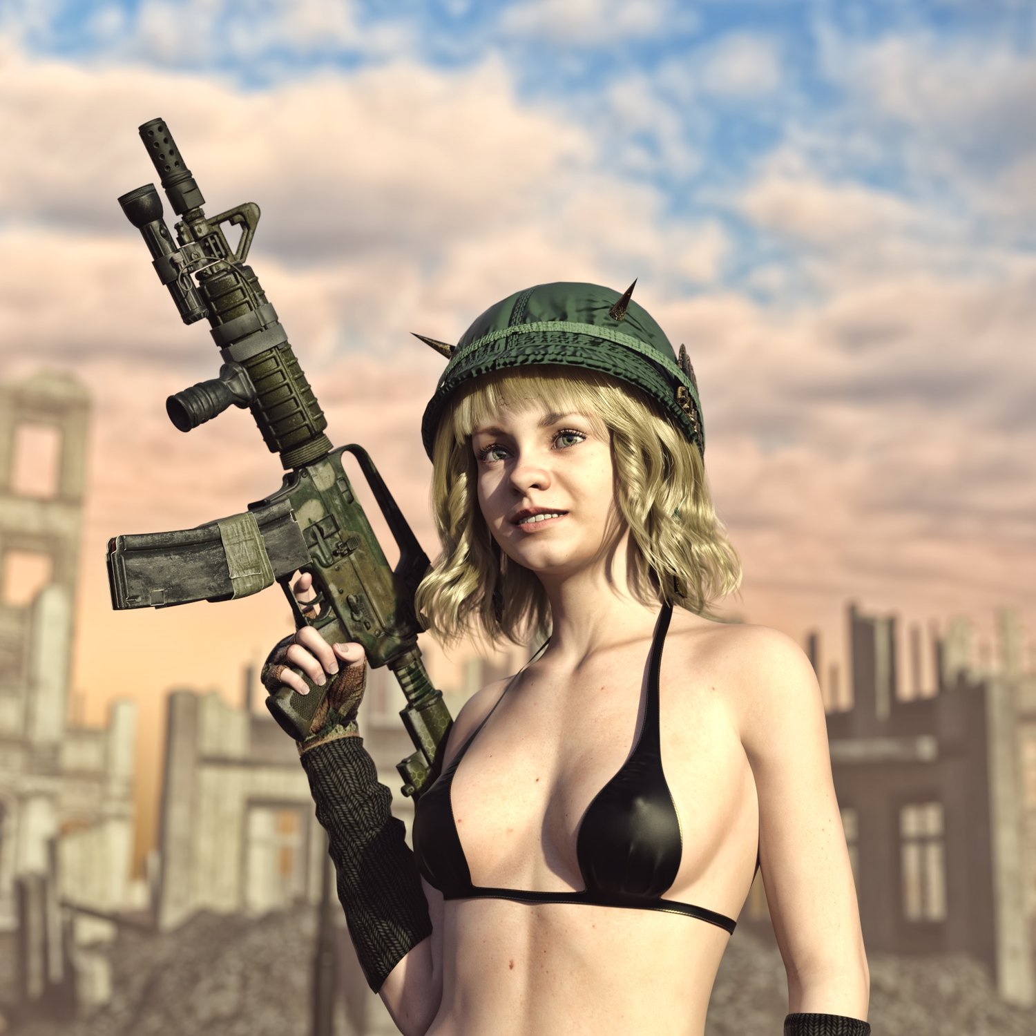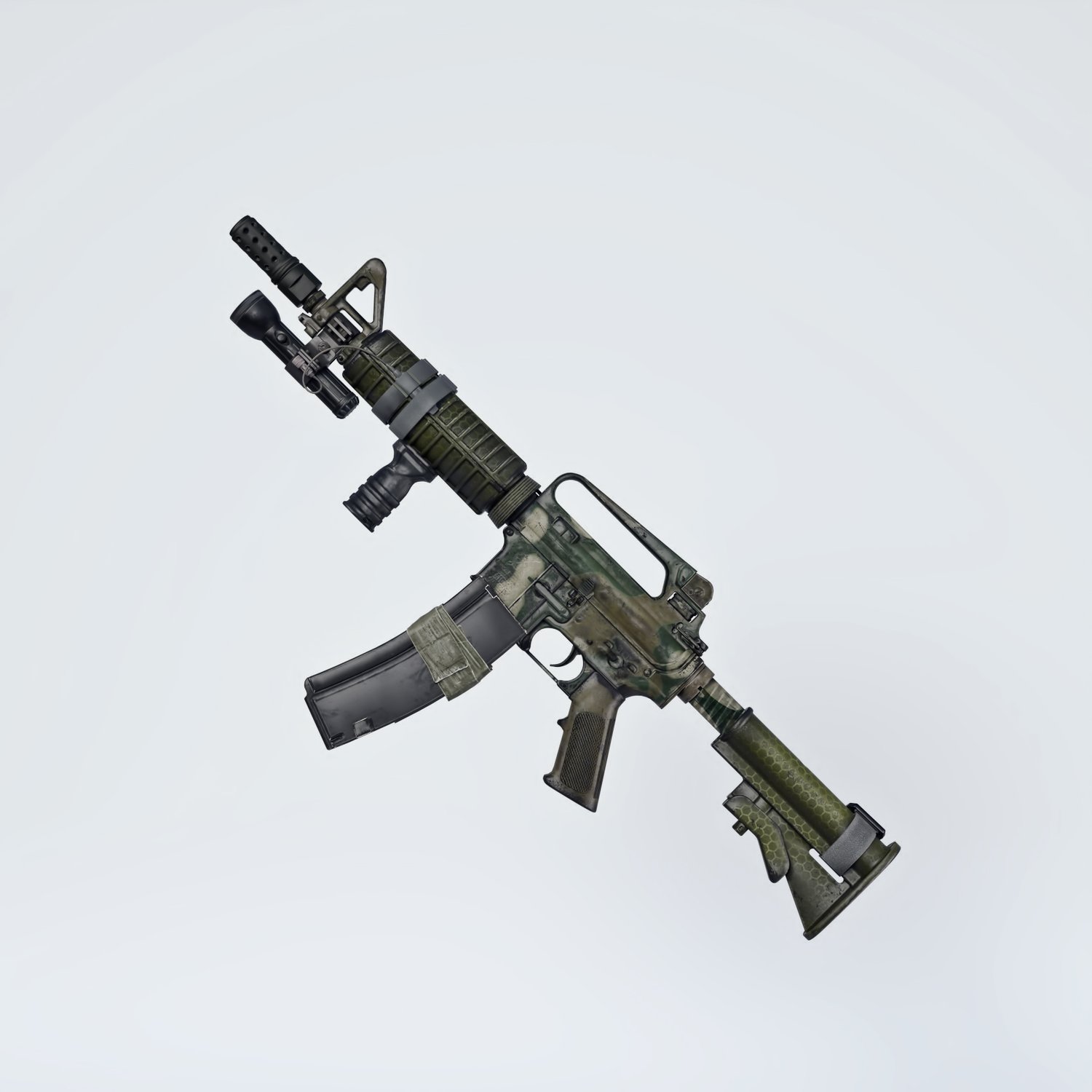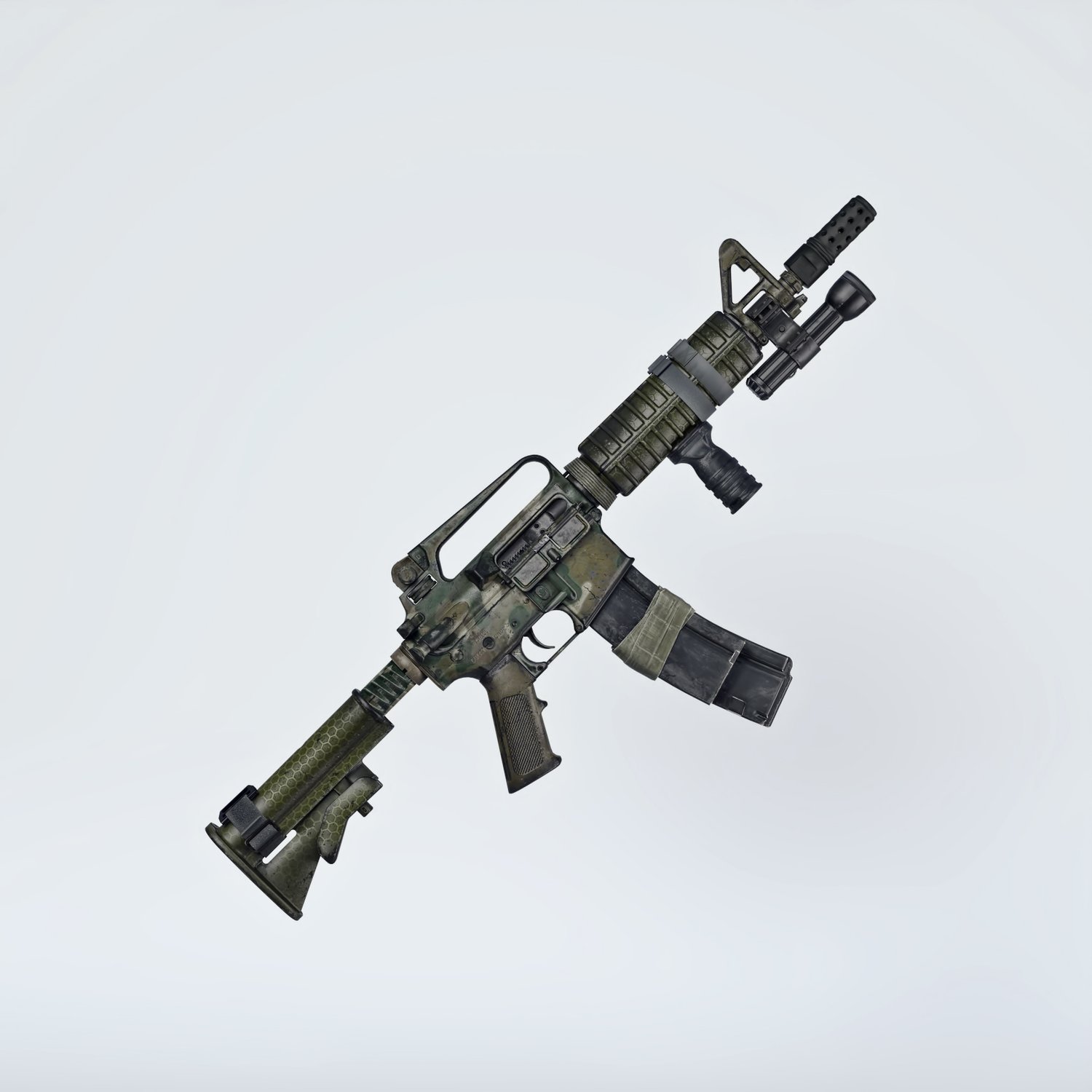 A short variant of the classic model of AR-15/M16 rifle, with some upgrades for added coolness. Includes a front grip, flash light, different muzzle device and dual magazine. For the lovers of classic M16 variants. Trigger, safety, bolt, bolt cover etc also rigged for more realistic pictures.