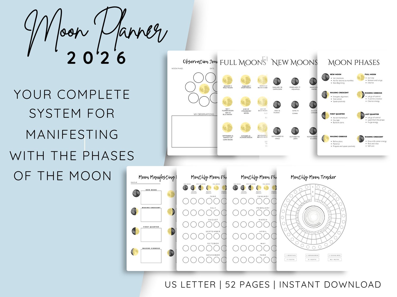From daily moon phase trackers, moon cycle prompts, tarot spread guidance to daily reflections, this pdf has everything you need to learn about phases of the moon and use the monthly cycles to help you in your manifestation journey in 2026.