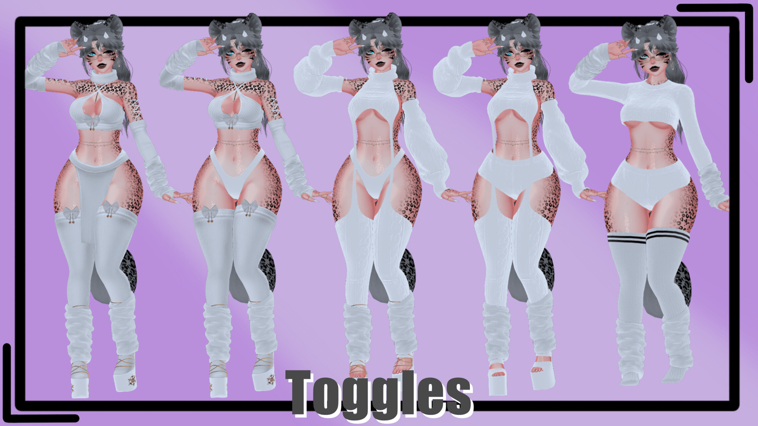 ♡ | Toggles: | Outfit: Knitted with Skirt, Knitted w/o Skirt, Virgin Killer Fit, Virgin Killer with Shorts, Comfy Set, Knitted Sleeves, Puffy Sleeves, No Sleeves, Snowflake Heels, Strap Heels, No Shoes, Ears, Tail, Pony Tail, Long Hair, Short Hair |