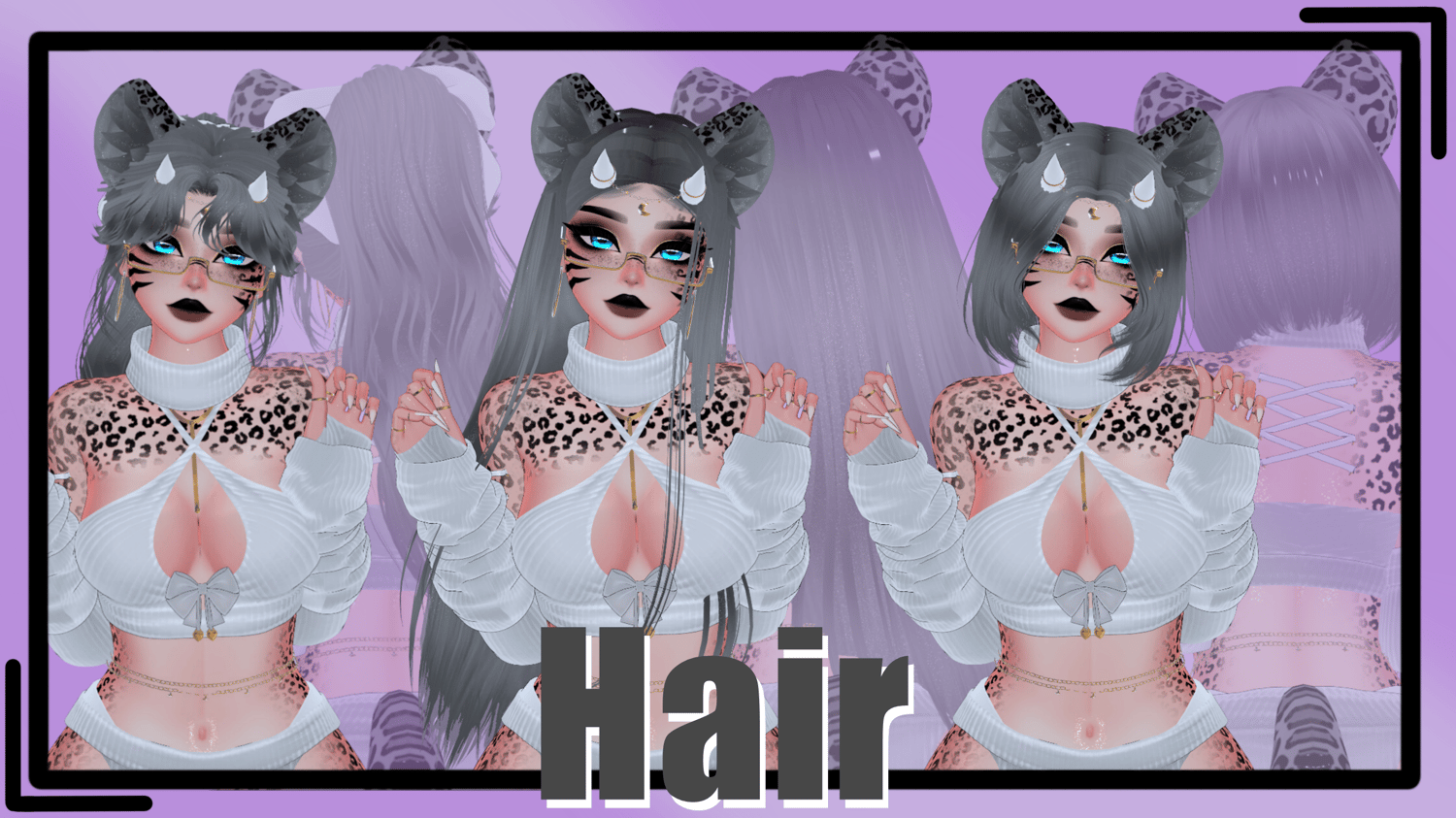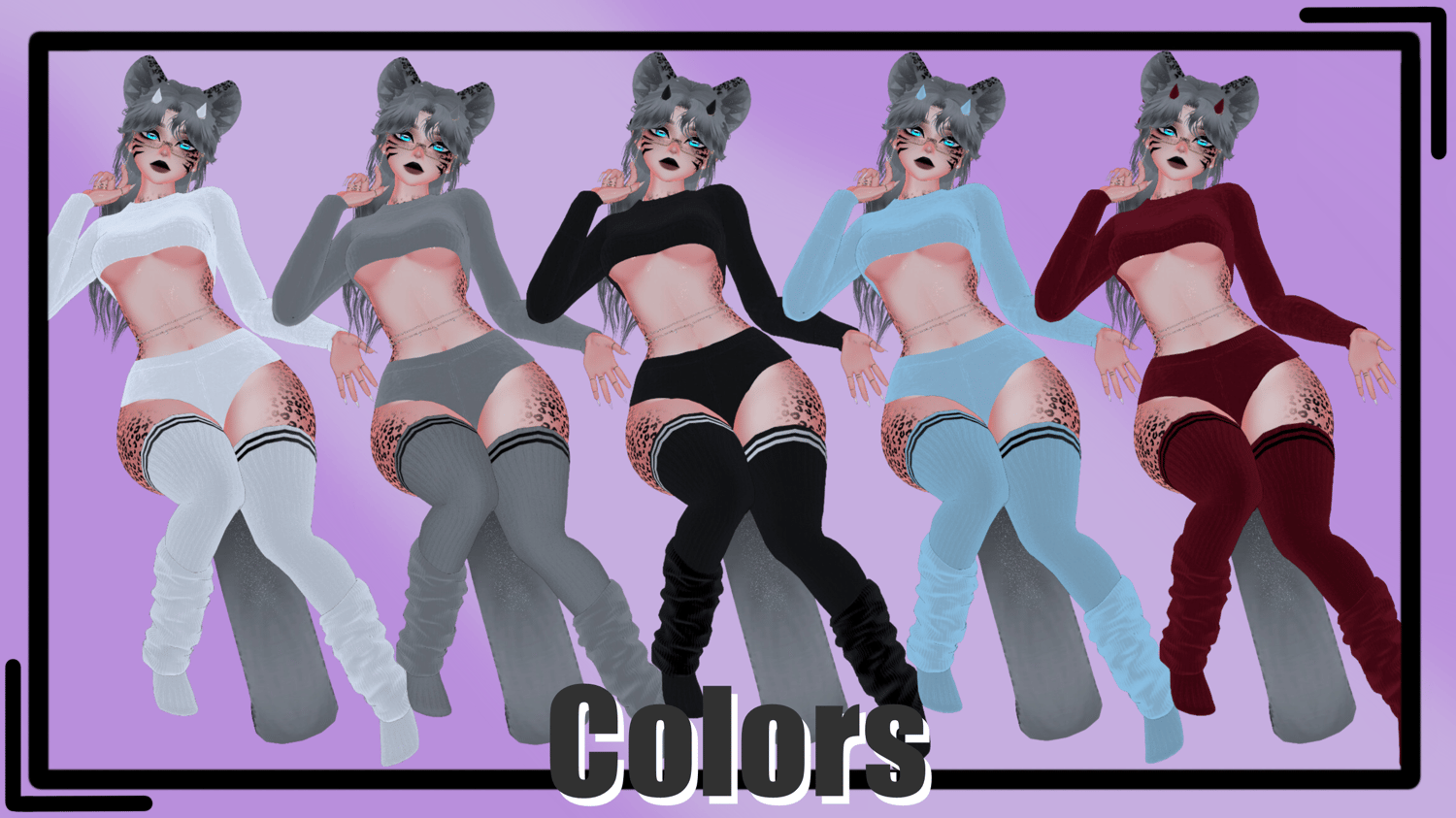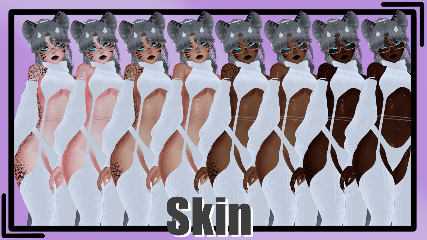 | Body by Pandaabear#9873 (EDITED BY ME, NO REUSE) | Head/Head Textures by DUCC#0008 (EDITED BY ME, NO REUSE) | Main Body Texture by Ying#6669 (EDITED BY ME, NO REUSE) | Hair Textures by Cicieaaa#7777 | Fake Index by Milkers~#4457 | VRCFury Tool | GoGoLoco by Franada | Rings by xSnail#2902 | Knitted Outfit by MEEVA | Leg/Arm Warmers by MEEVA | Short/Long Hair by Saikura | Ponytail by @NESSY | Virgin Killer Outfit by TheThiccWitch | Strap Heels by Rice | Leopard Ears/Tail by OliverVRC | | Stitches by Roxyne | Horns by Agastopi#0001 | Wireframe Glasses by lexivon | Frame Glasses by Nini | Earrings by Skulli | Necklace by Bookieson | Butterfly Belly Chain by Peep | Thigh Highs by Darcy.fbx |