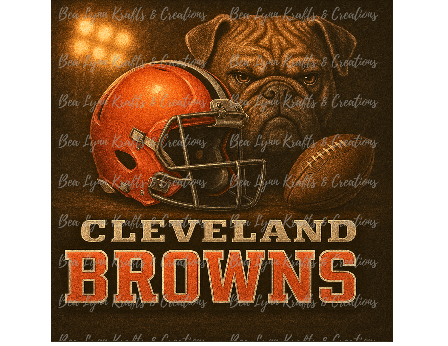 This Cleveland Browns Bulldog PNG features a powerful, gritty football-themed design centered around the iconic tough bulldog mascot. The intense bulldog stares forward with a fierce expression as a glossy Browns helmet and textured football sit in the foreground. Warm stadium lighting and deep brown tones create a dramatic, game-day atmosphere perfect for die-hard Cleveland fans.