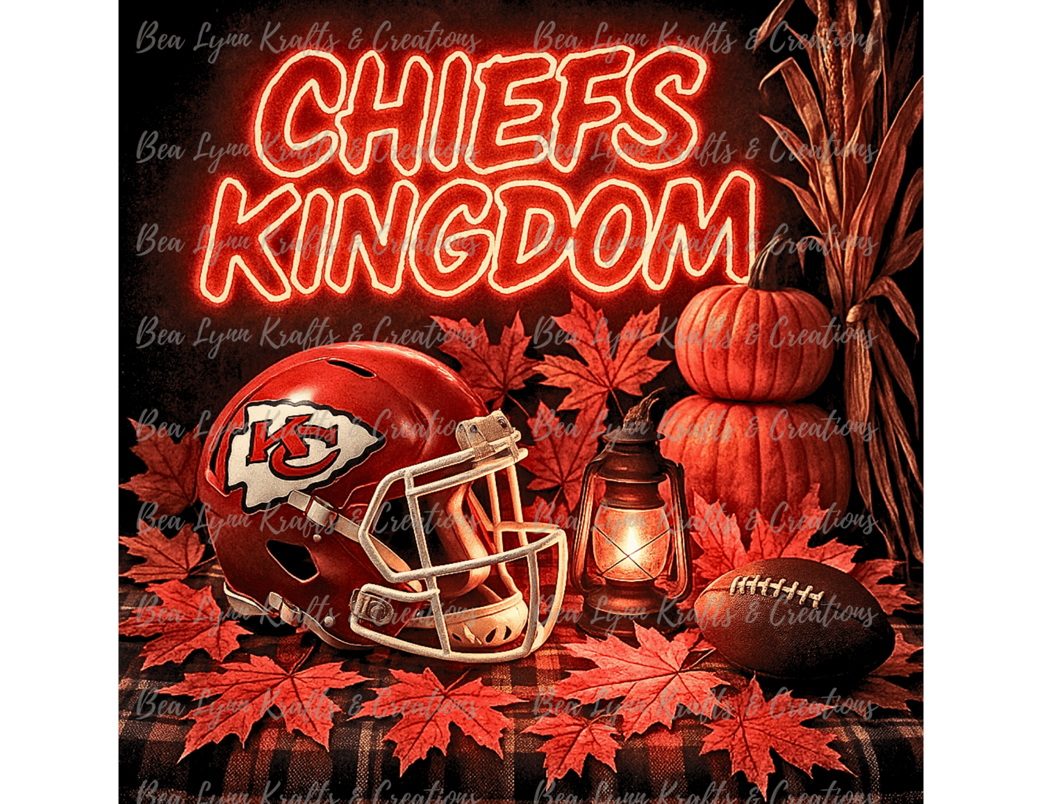 🔥🏈 Chiefs Kingdom, light it up! This Kansas City Chiefs PNG brings the perfect mix of football pride and fall vibes, featuring a bold “CHIEFS KINGDOM” neon-style wordmark glowing above a seasonal autumn setup. With a detailed Chiefs helmet, stacked pumpkins, rustic corn stalks, maple leaves, a glowing lantern, and a football resting on a plaid table, this design is built to electrify game day and seasonal décor alike.