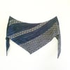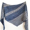 This is an asymmetrical triangular shawl worked from a few cast on stitches out to the broad edge. The shawl uses two very contrasting skeins of yarn and decorative mosaic (slip stitch) panels. The shawl is finished with a contrasting i-cord bind off.
