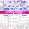 Comprehensive practice with 3-digit minus 2-digit subtraction fueled by those who need extra practice or have been recently introduced to regrouping which maybe daunting. This beautiful 34 page booklet provides wonderful graphics for the kiddos to keep them engaged and provides and array of cut and paste worksheets for the students to see options in their answers allowing them to know whether the answer they have provided is correct. See, if you cut the answers and have them in front of you and you don't find the one you got then that means its wrong. So it's essentially a self check for the students. For the other types of sheets provided the student will have practice without having a recourse as to looking for answers and therefore trust in themselves that they are able to answer each problem.