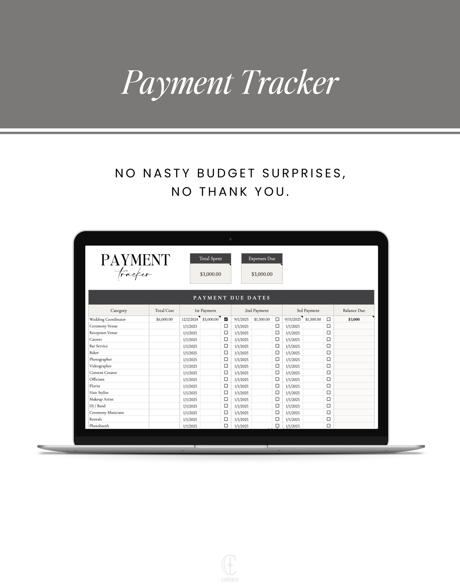 All templates sold by Chèque are protected under copyright law and are for PERSONAL USE ONLY. Any unauthorized reproduction, redistribution, recreation, or resale of these templates, in part or in whole, is strictly prohibited. By purchasing and downloading our templates, you agree to abide by these terms and conditions.