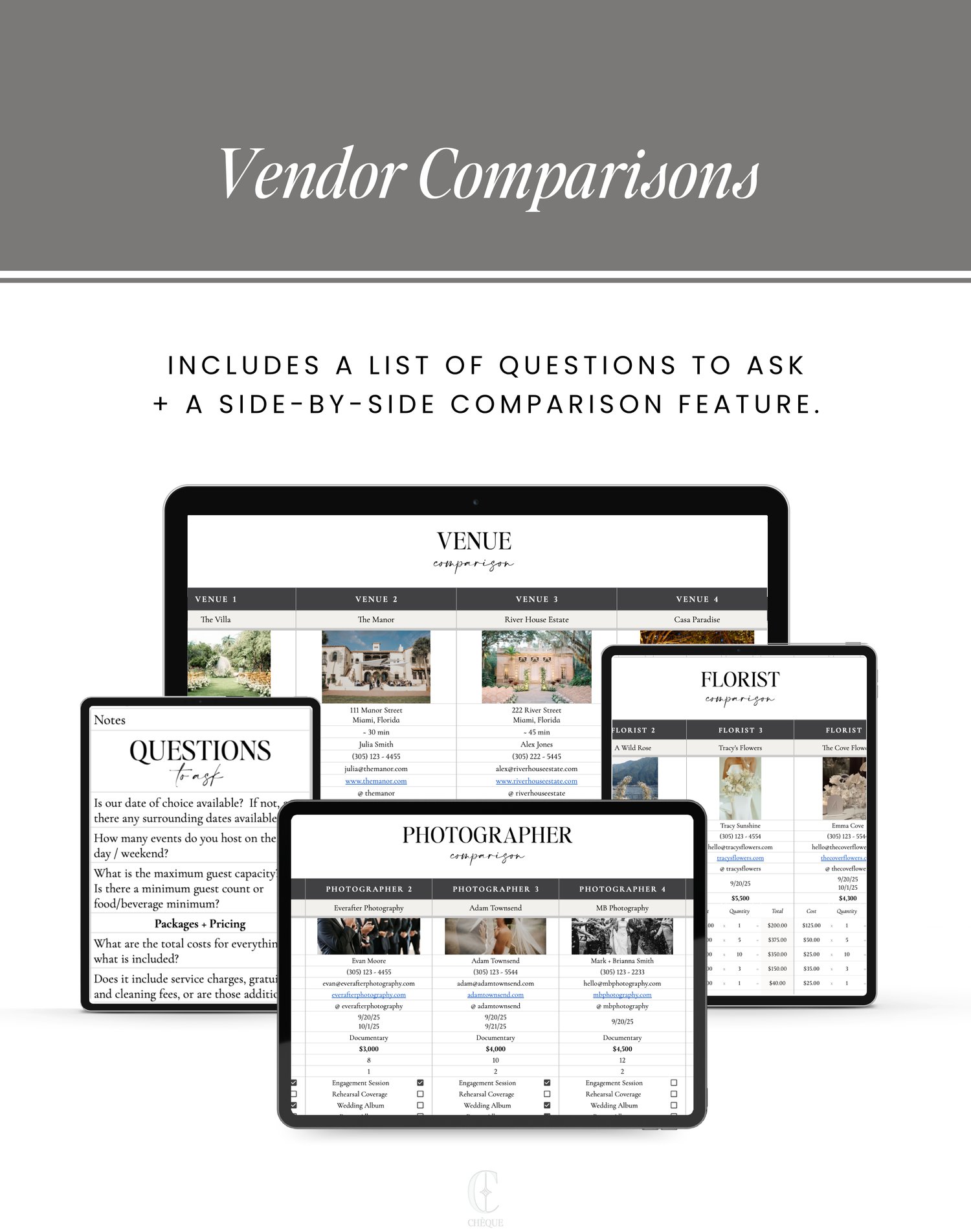 ✨ 14 Vendor Shopping Comparison Tabs for the venue, caterer, coordinator, photographer, videographer, content creator, florist, rentals, dj/band, hair/makeup, officiant, stationery designer, baker, transportation