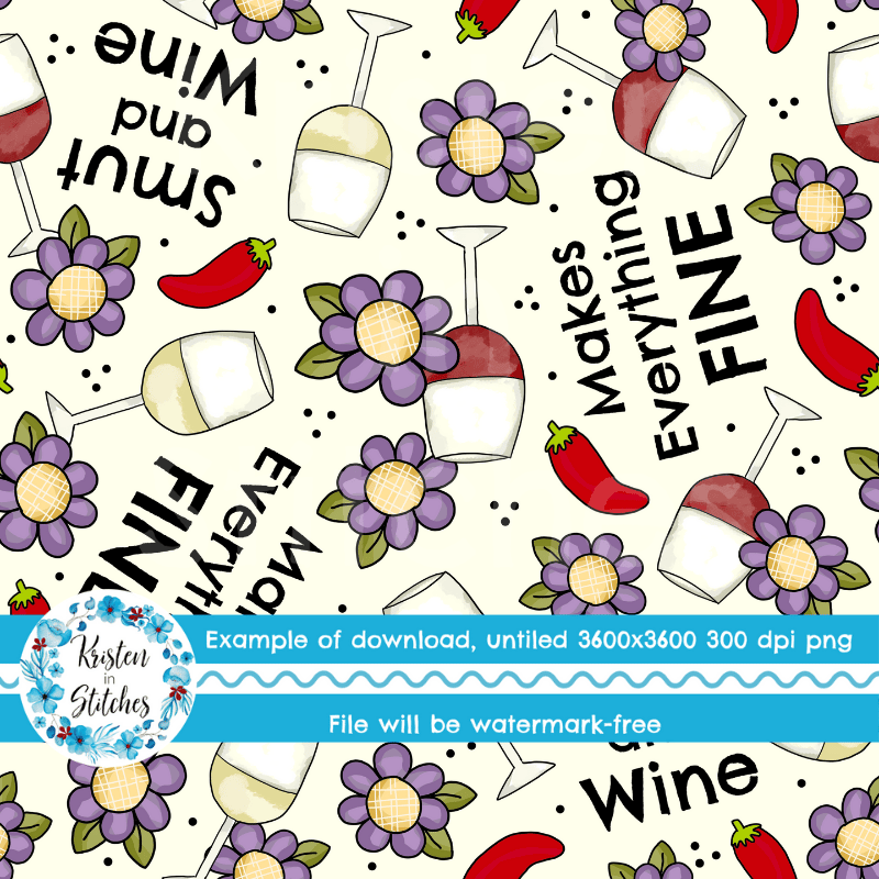 Smut and Wine spicy book lover pattern with flowers, red peppers and wine glasses.