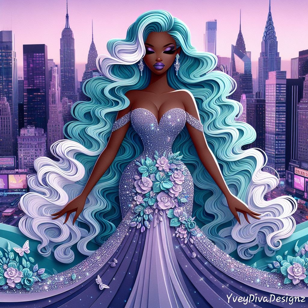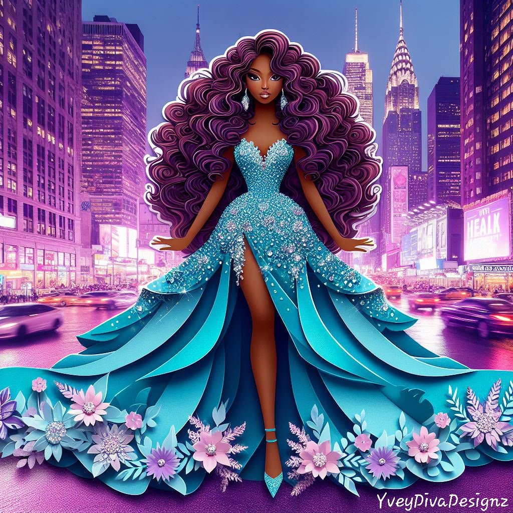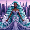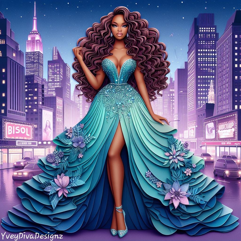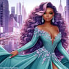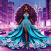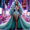 A stunning 3D paper art print featuring a woman in a luxurious teal dress, standing gracefully in the bustling city streets. The intricate details and layered design bring depth and elegance to this urban scene.