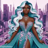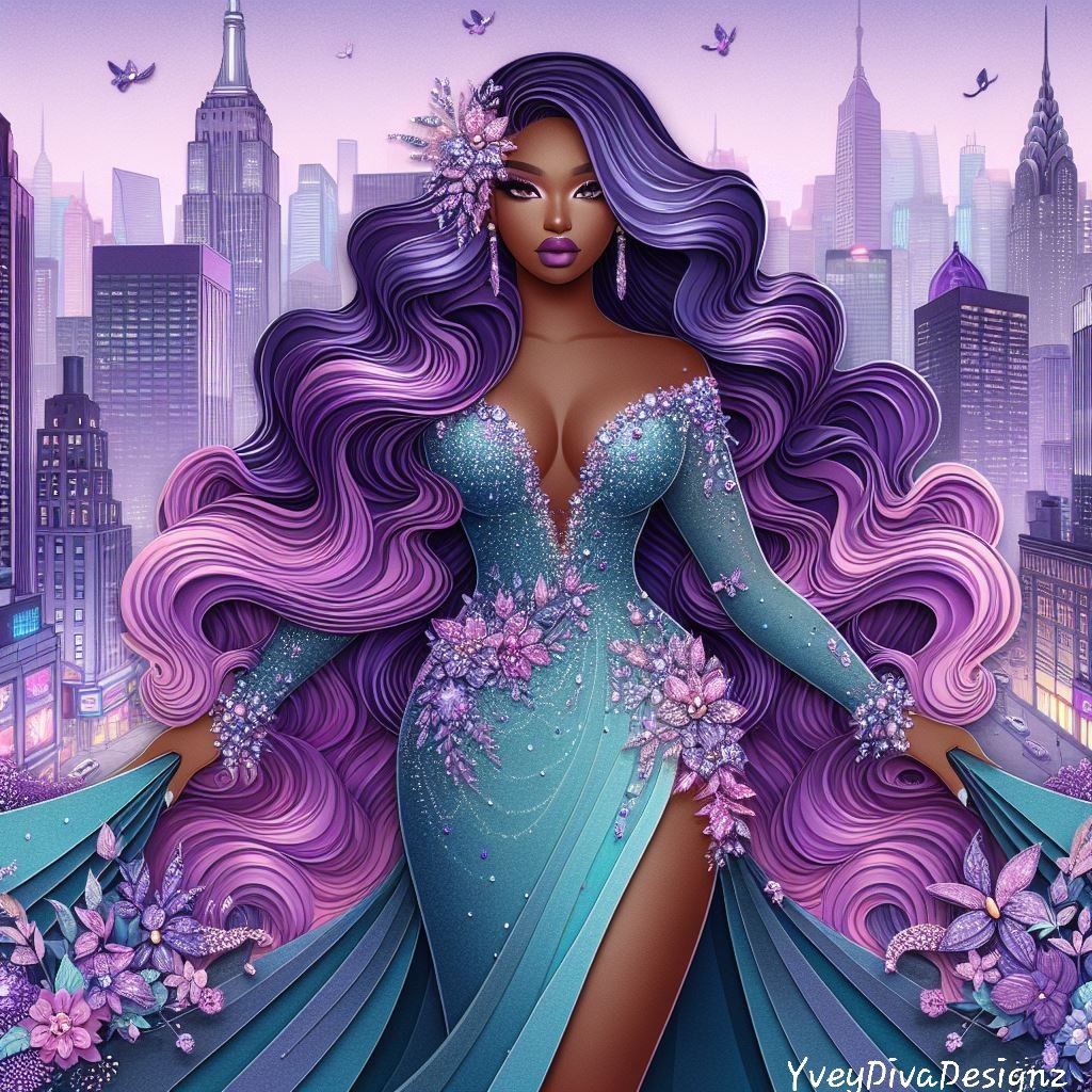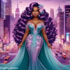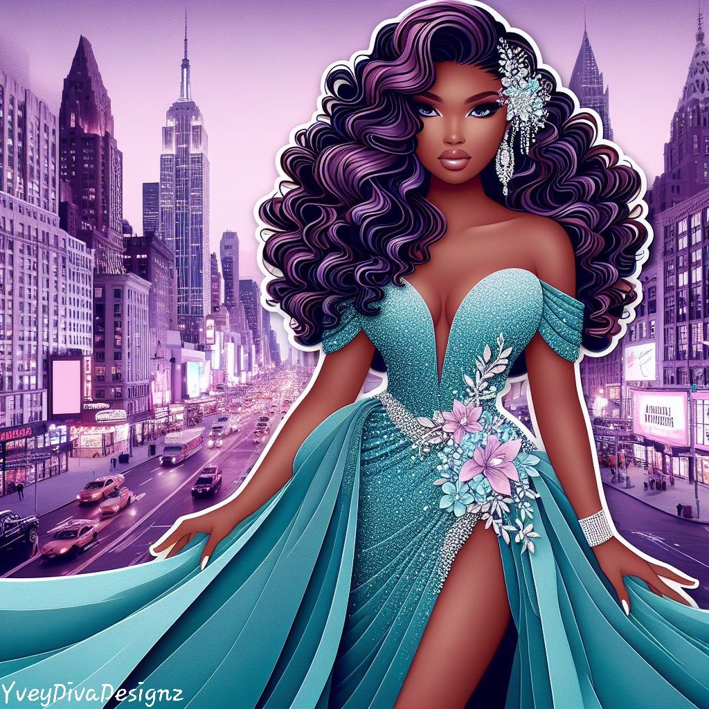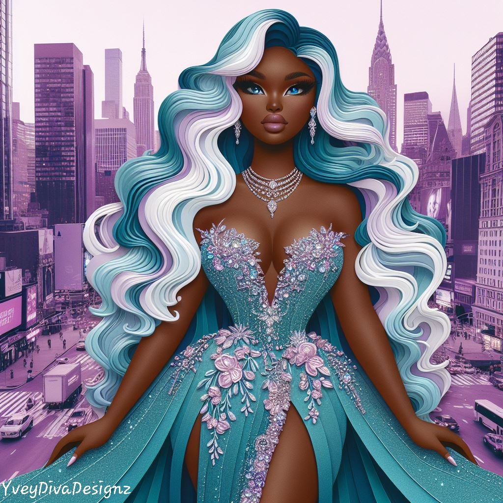 A stunning 3D paper art print featuring a woman in a luxurious teal dress, standing gracefully in the bustling city streets. The intricate details and layered design bring depth and elegance to this urban scene.