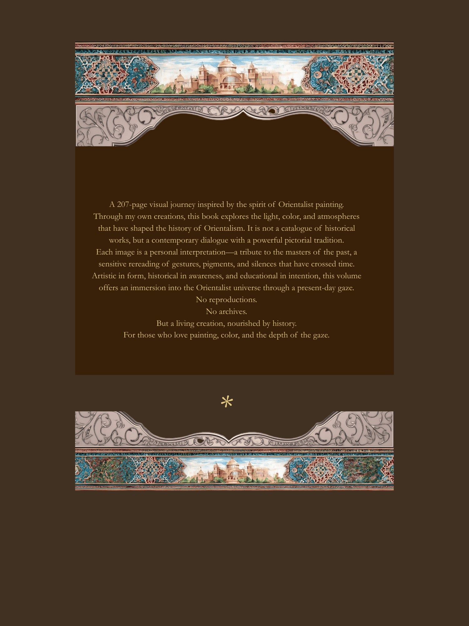 Through original contemporary creations, this volume explores light, color, composition, and atmosphere—engaging in a thoughtful dialogue with one of the major movements in art history. It does not reproduce historical works; rather, it offers a personal and reflective reinterpretation shaped by an awareness of Orientalist aesthetics.