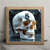 Number 5 skull obsidian marble deeply engraved character on the forehead of a white marble skull. The character, filled with dark obsidian, contrasts sharply against the pale skull. Set against a black crystalline background, the skull and character dominate the image.