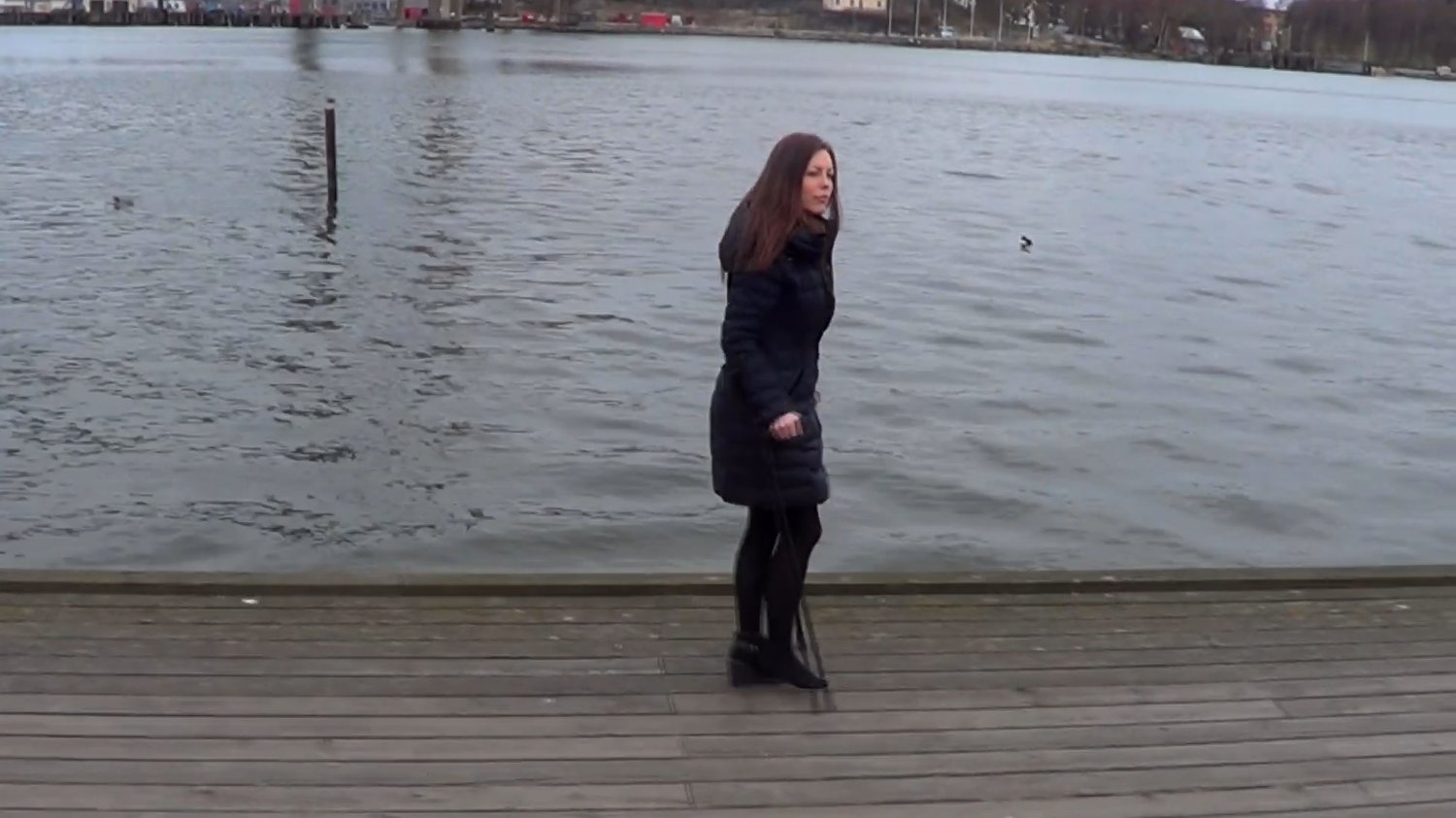 Melinda crutch along the water with a sprained ankle.She just has black tights on her hurt foot and is first crutching nwb but after some time she trys to put her toe down on her hurt foot and walk tip toe with help of her crutches.She later sits down and take on a black sock on her hurt foot before she crutch on along the water.