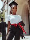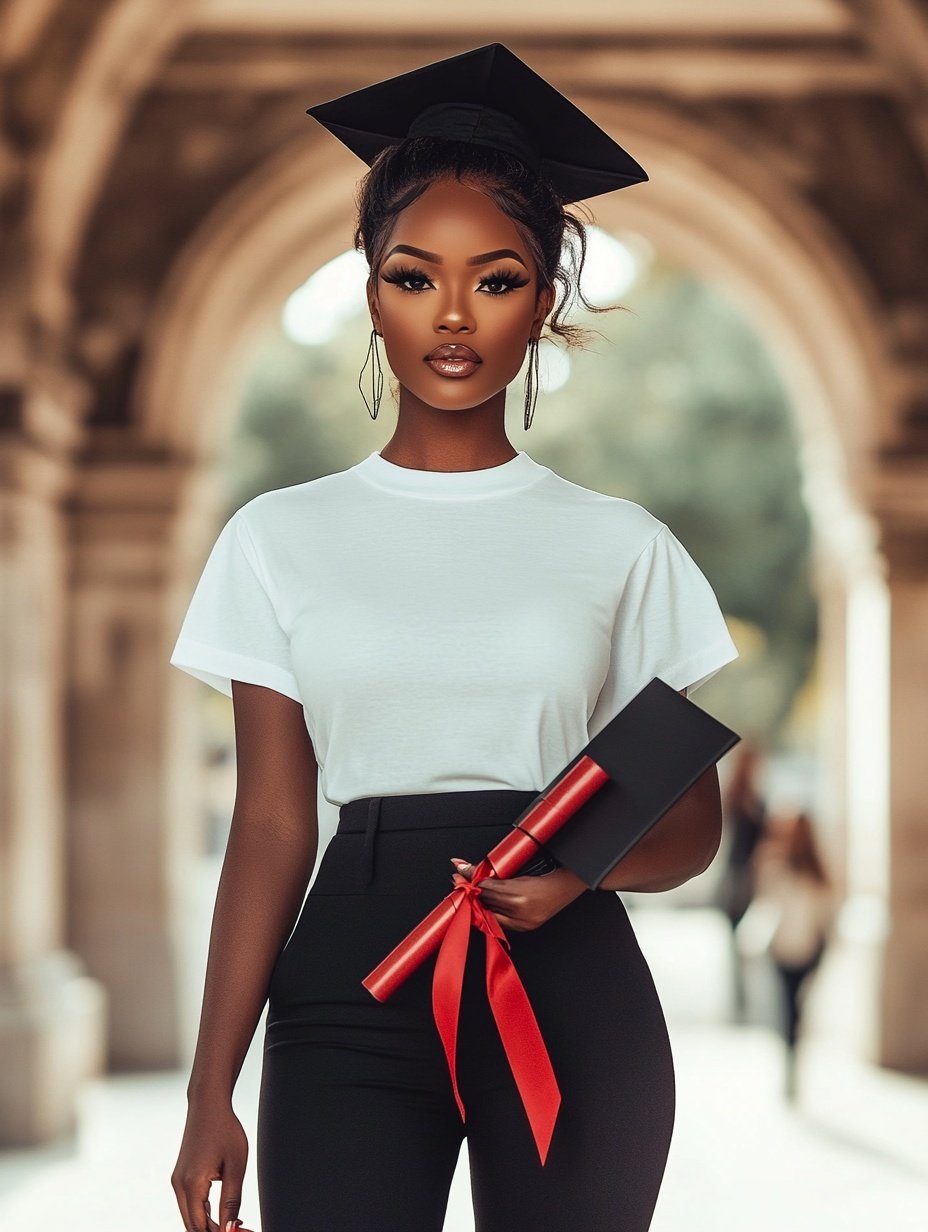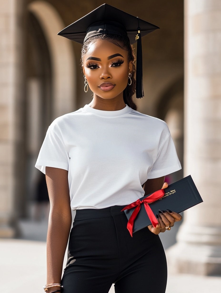- Graduate model in cap + gown sleek slacks (clean and realistic)
