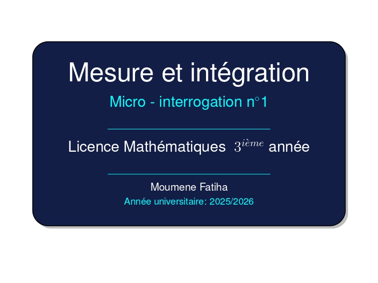 Ce document regroupe la première micro-interrogation du module Mesure et intégration pour l’année universitaire 2025-2026. Il s’adresse aux étudiants inscrits en troisième année de Licence Mathématiques, et constitue une évaluation essentielle pour tester leur compréhension des notions fondamentales de la théorie de la mesure et de l’intégration.