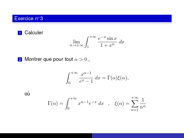 Certaines questions demandent une justification détaillée (type Vrai ou Faux, justifier votre réponse), tandis que d’autres exigent des calculs d’intégrales et la démonstration d’égalités classiques impliquant les fonctions spéciales telles que Γ(s) et ζ(s).