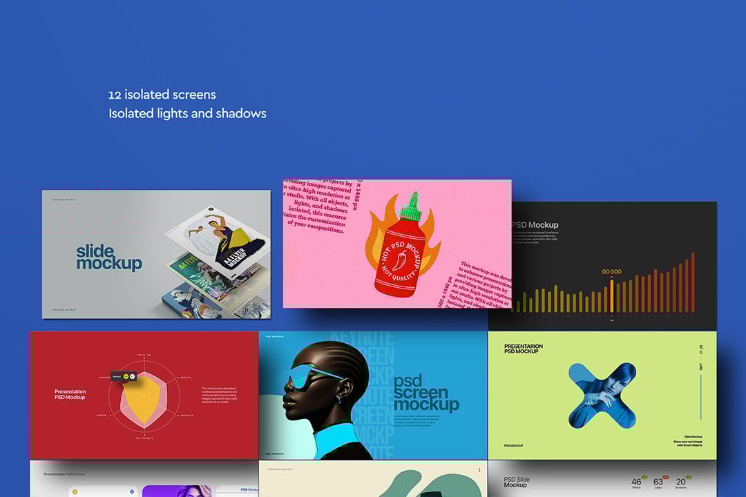 Photorealistic presentation screen-slide mockup pack with twelve isolated views, editable Smart Objects and independent lights & shadows.