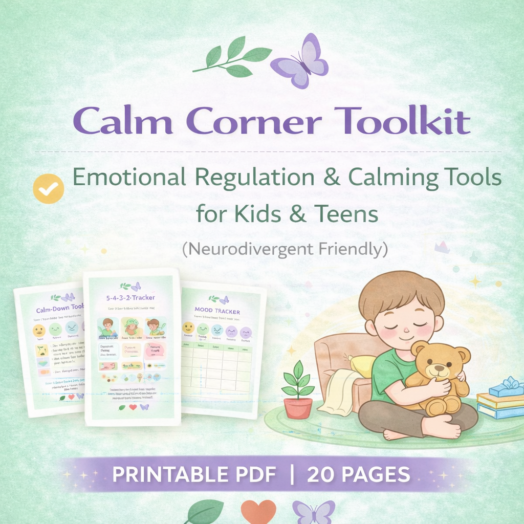 A gentle, neurodivergent-friendly printable toolkit designed to help kids and teens calm their minds, regulate emotions, and feel safe when big feelings show up.