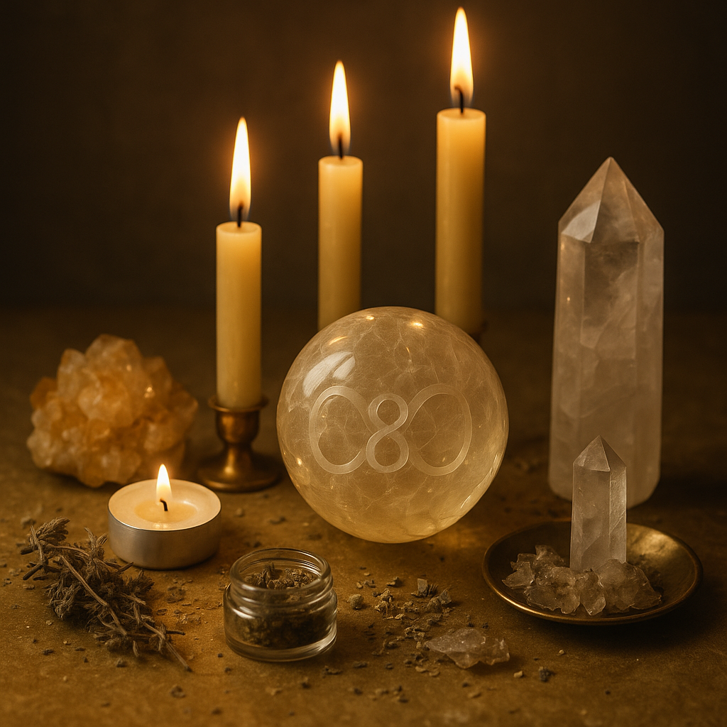 - Full candle spell with aligned herbs, crystals, oils, and planetary timing