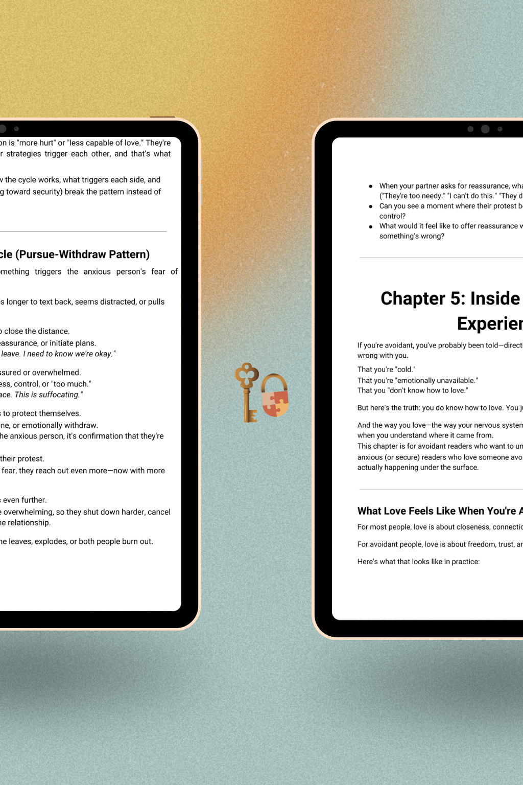 this handbook was built specifically for the anxious-avoidant dynamic. every chapter, every script, every tool is written for what you're actually experiencing.